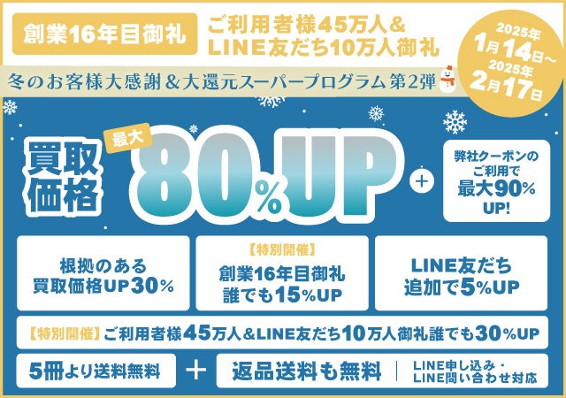 冬のお客様大感謝・大還元 スーパープログラム 買取価格最大80%アップ【ご利用者様45万人&LINE友だち10万人&創業16周年御礼企画】