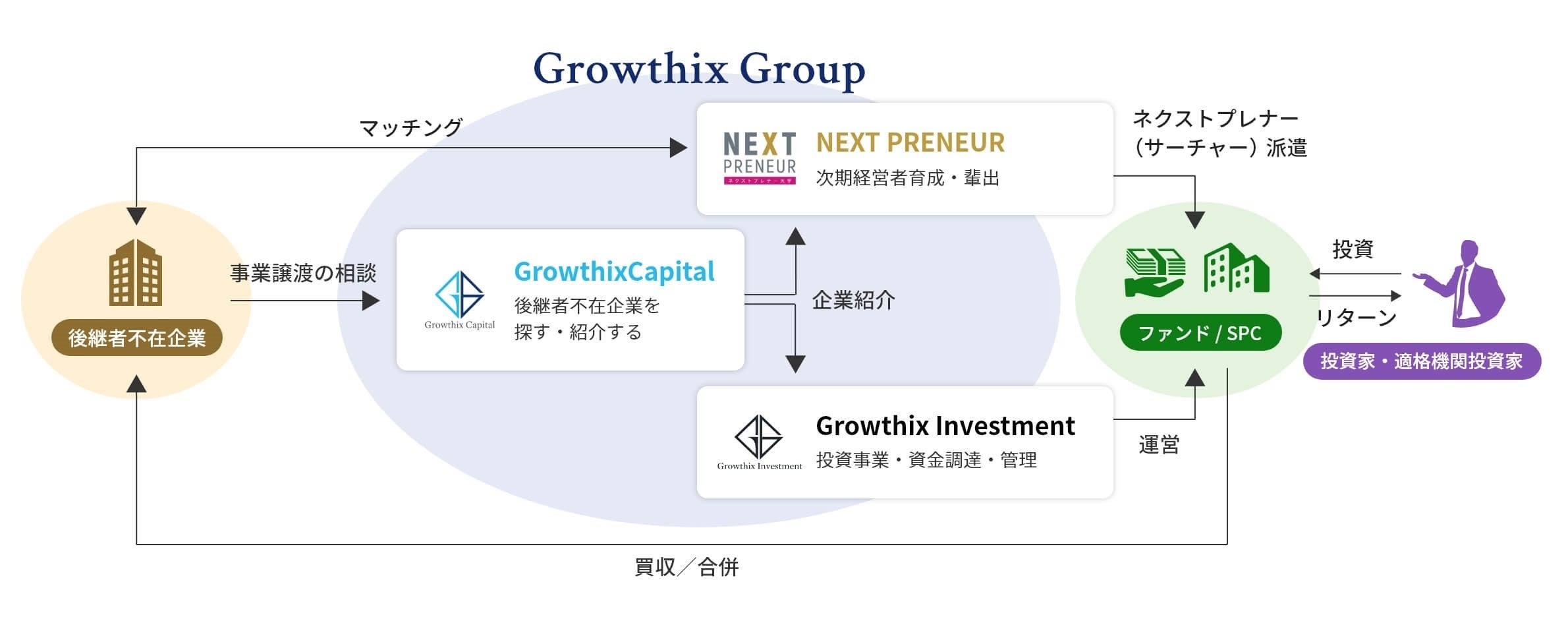 サーチファンドは、SPC(特別目的会社)を設立し、投資家やファンドから資金を調達してSPCが会社を買収する形式をとります。弊社ではグループのGrowthix Investment株式会社が資金調達とファンドの組成・運営を担当します。