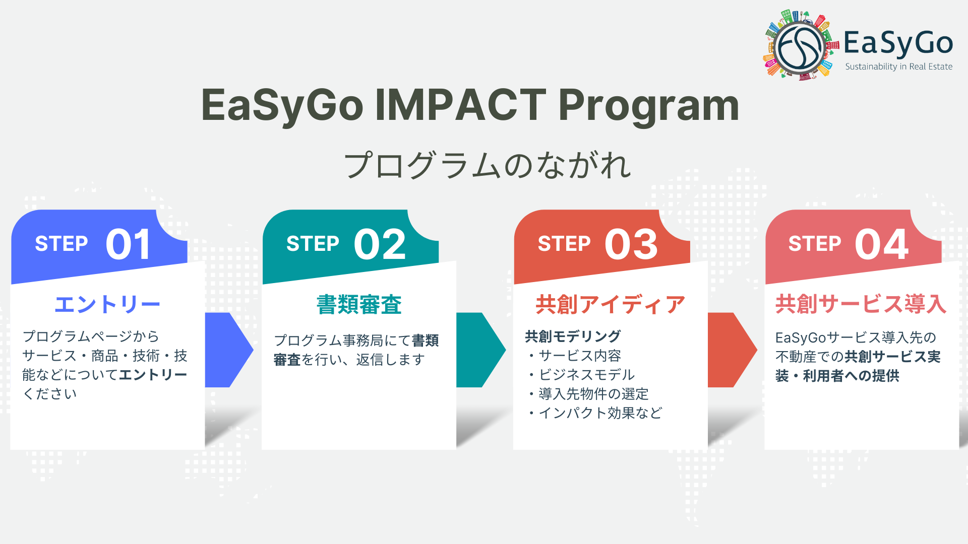 「EaSyGo IMPACT Program」は、EaSyGoサービスが導入されている不動産を起点に360°のライフスタイルサービスを一緒に提供するパートナー企業との共創プログラムとして、食、移動、エネルギー、ウェルネス、防災、教育、などサステナビリティを価値に連携するサービスや商品を募集します。
