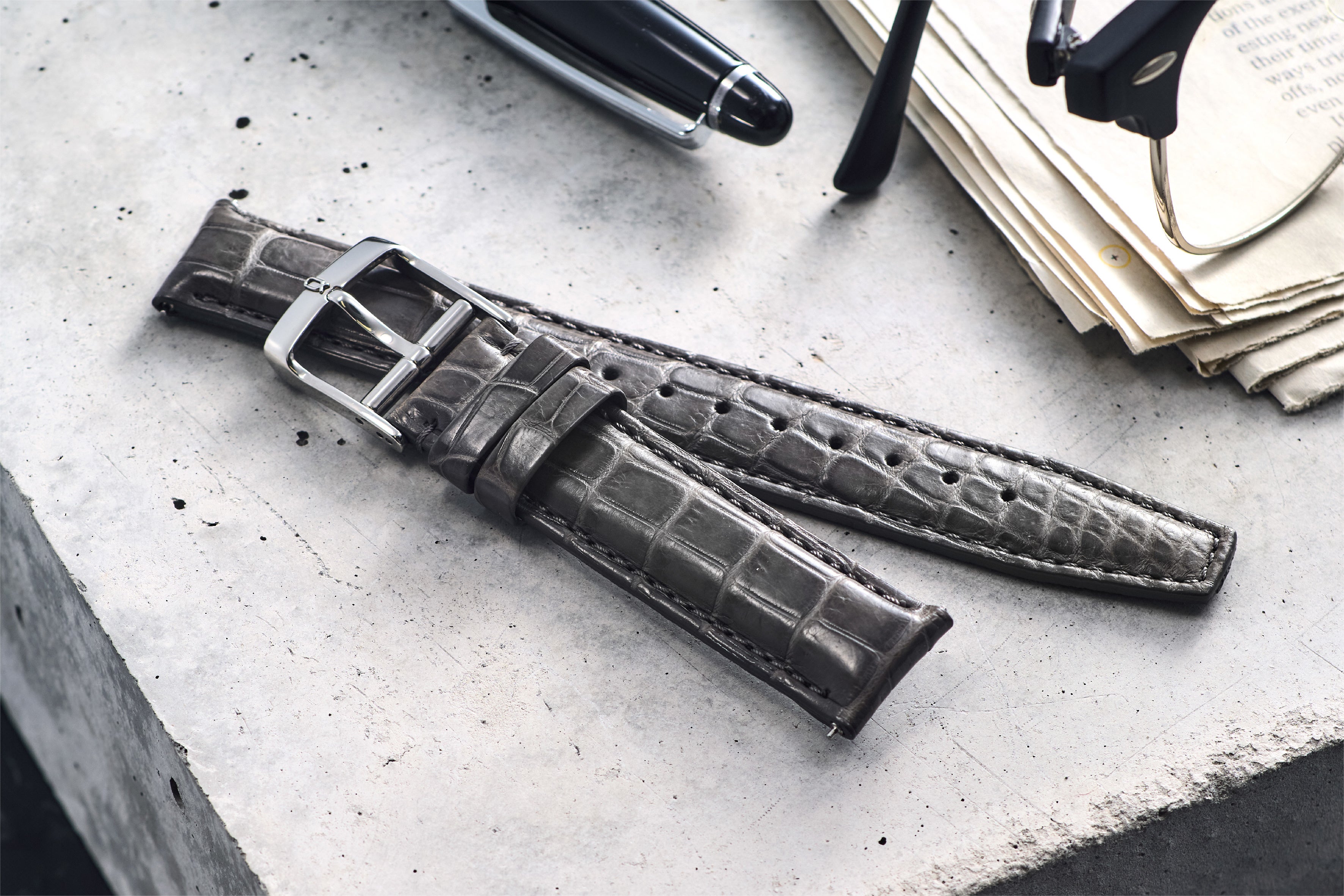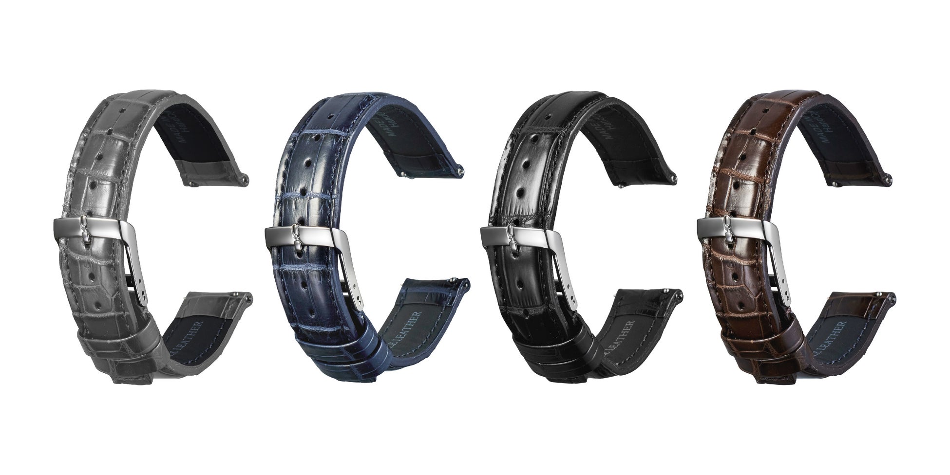 4色から選べる、希少なクロコダイルストラップとセットでお届け。