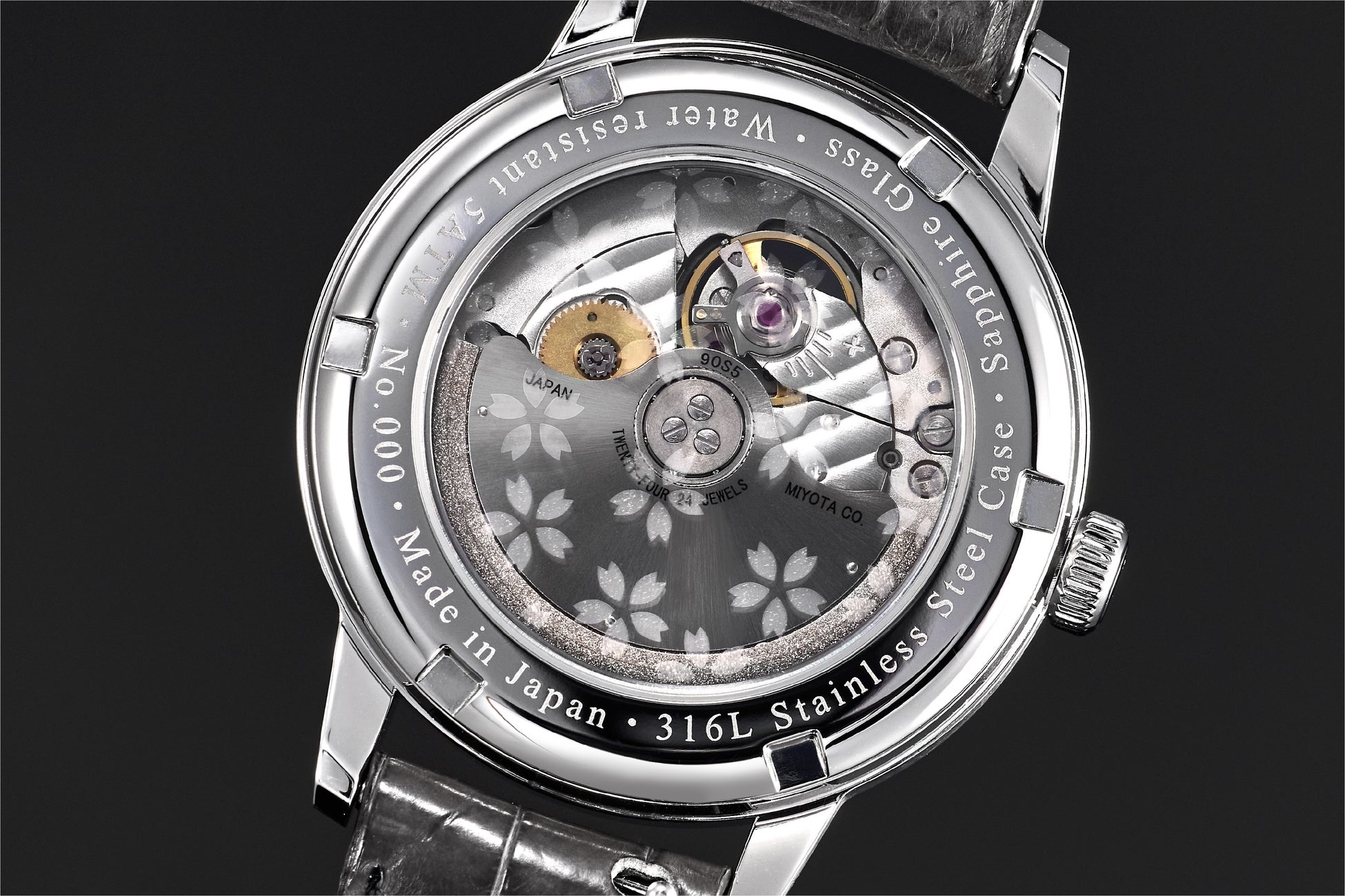 文字盤と同様に裏蓋のサファイアガラスにも散りばめられた桜のモチーフ。シースルーバックからは、毎時28,800振動を刻む日本製ハイビートムーブメントが覗けます。さらに限定モデルならではのシリアルナンバー入り。