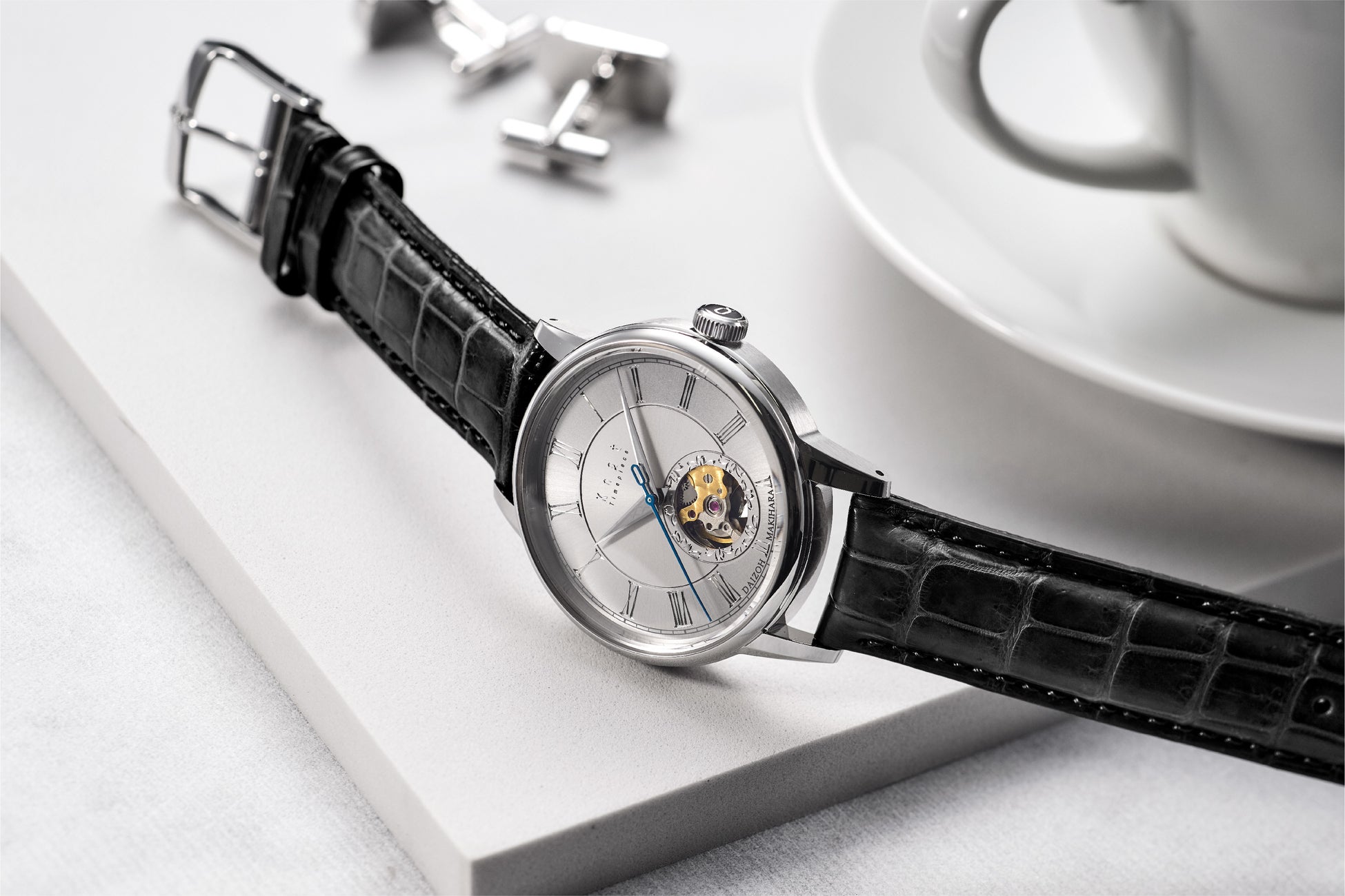 熟練職人によるザラツ研磨ケースに高性能日本製ハイビートムーブメント搭載。