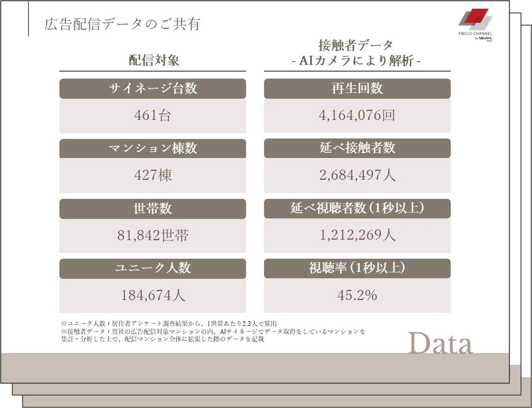 さらに、「FOCUS CHANNEL」では、広告出稿期間後のマンションの居住者/非居住者別ブランドリフト調査の実施や、放映マンションとコンバージョンに至った顧客住所との突合を通じ、ブランド認知効果の定量化や精緻なROAS効果検証が可能であり、ご好評をいただいております。