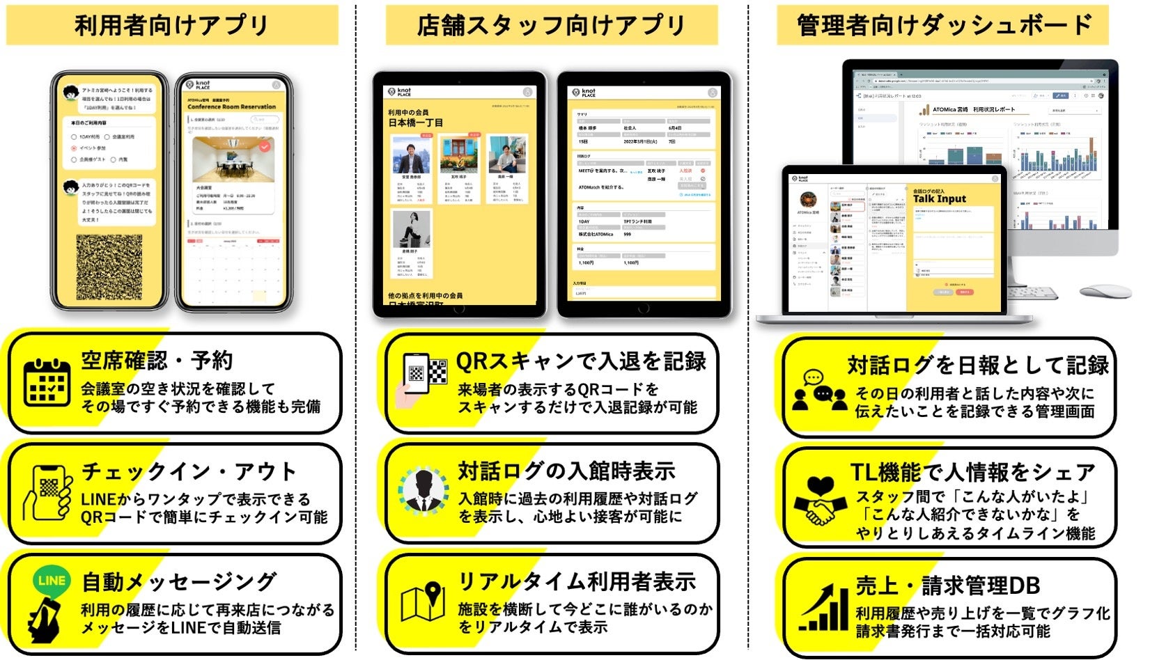 ATOMicaが各地でコワーキングを運営していく中で、あったらいいな、な機能を1つのアプリケーションに凝縮したコワーキング運営に特化したSaaSのサービス。利用者の満足度向上・再来店率向上に必要な機能を備え、コミュニティマネージャーの活動をサポートするツールです。