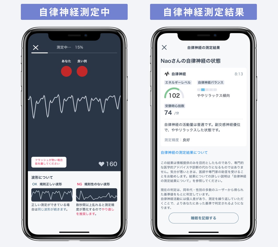 スマートフォンのカメラで読み取った心拍を、心拍変動解析(HRV解析:Heart Rate Variabiliy Analysis)という医学・生理学的な手法を用いて自律神経の活動を科学的に定量化しています。