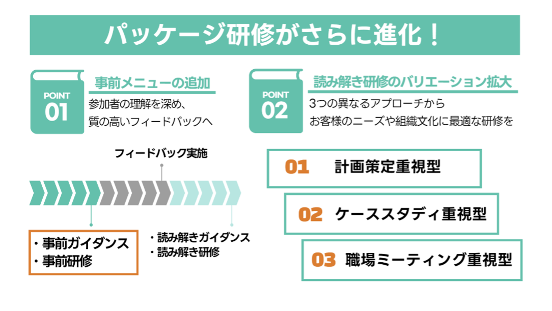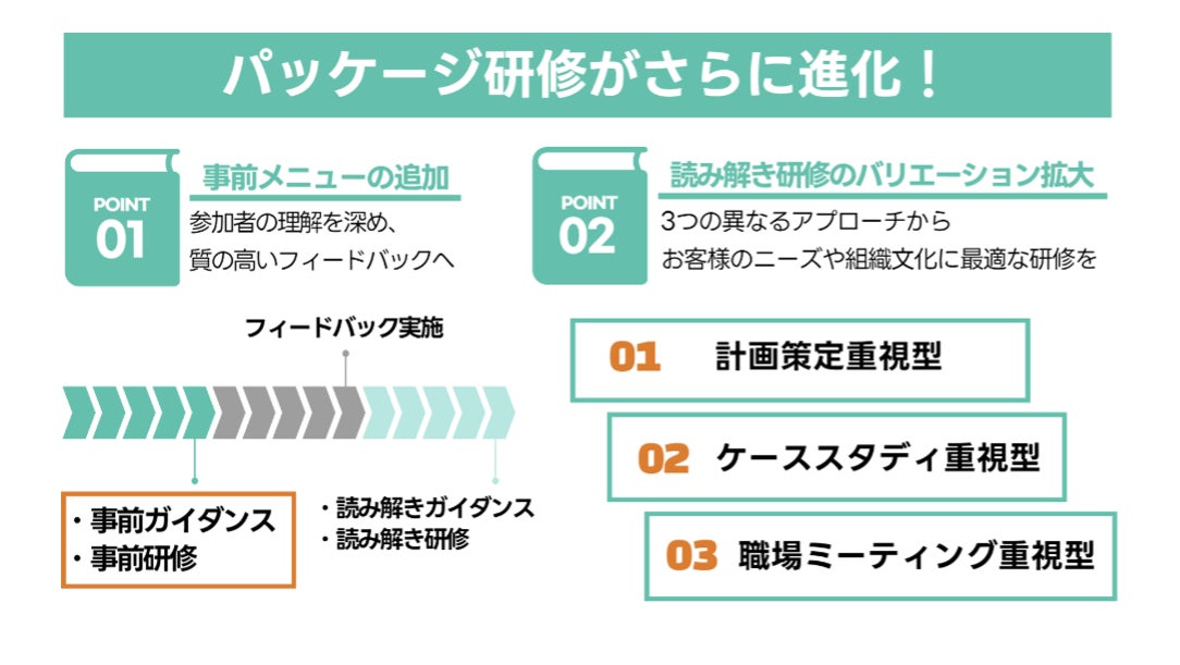 360度フィードバック実施前後のフォローとして、以下4種類のガイダンス・研修をご提供いたします。