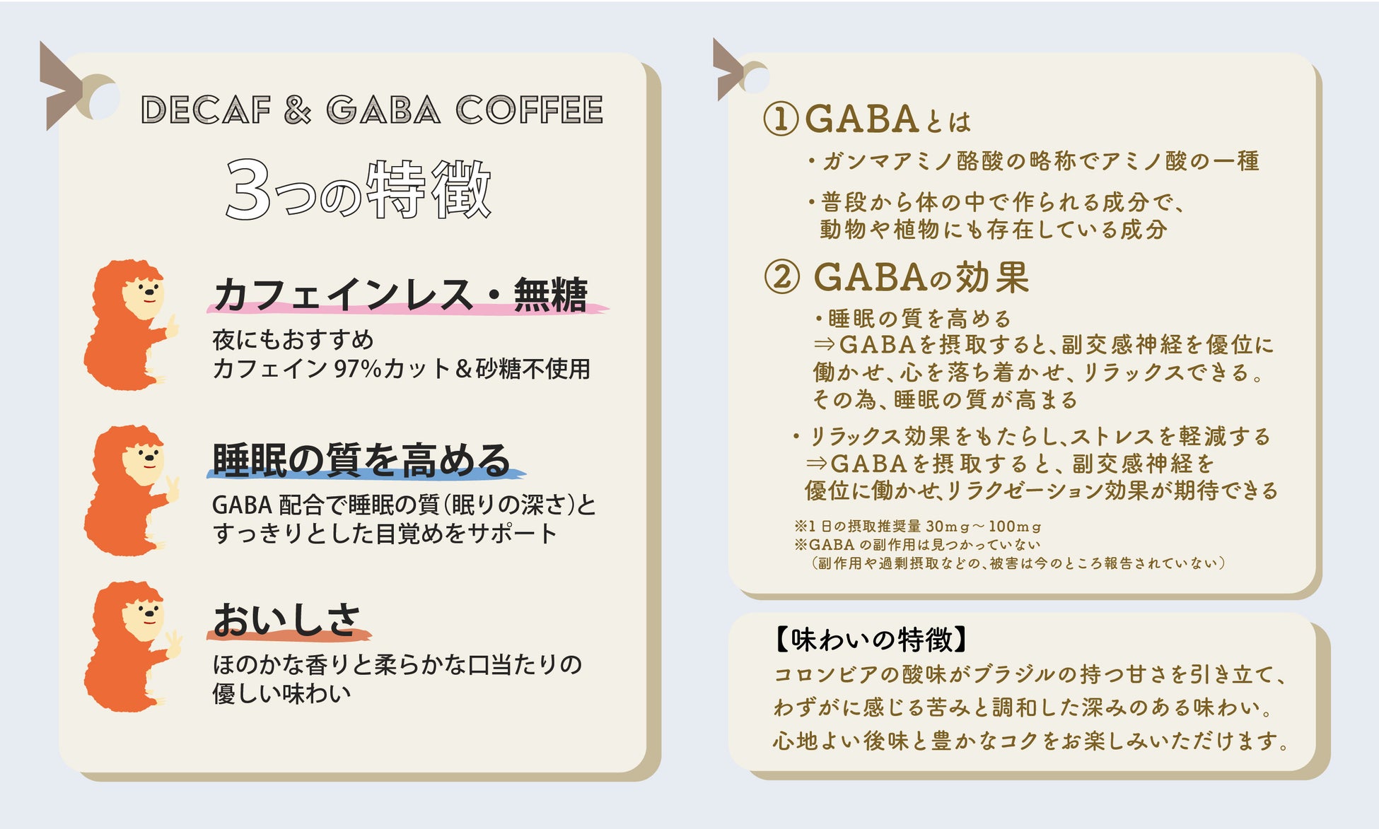 コーヒーの味や香りを好んでいても、体質や体調などによってカフェイン摂取を制限する必要があり、カフェインレスコーヒーを選択するものの、味に不満がある(味、香りが薄い、コクが感じられないなど)方が多い。また、おやすみ前にコーヒーでリラックスしたいけれどカフェインは摂取せずに、リラックスして深い眠りについてスッキリ目覚めたい。それらの声に応える商品として「GABA配合のコーヒー(機能性表示食品)」を開発いたしました。