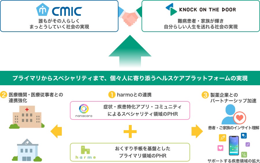 「nanacara」を運営するノックオンザドア株式会社が、患者・家族との社会インパクト早期創出のため、シミックホールディングス株式会社との資本業務提携を発表