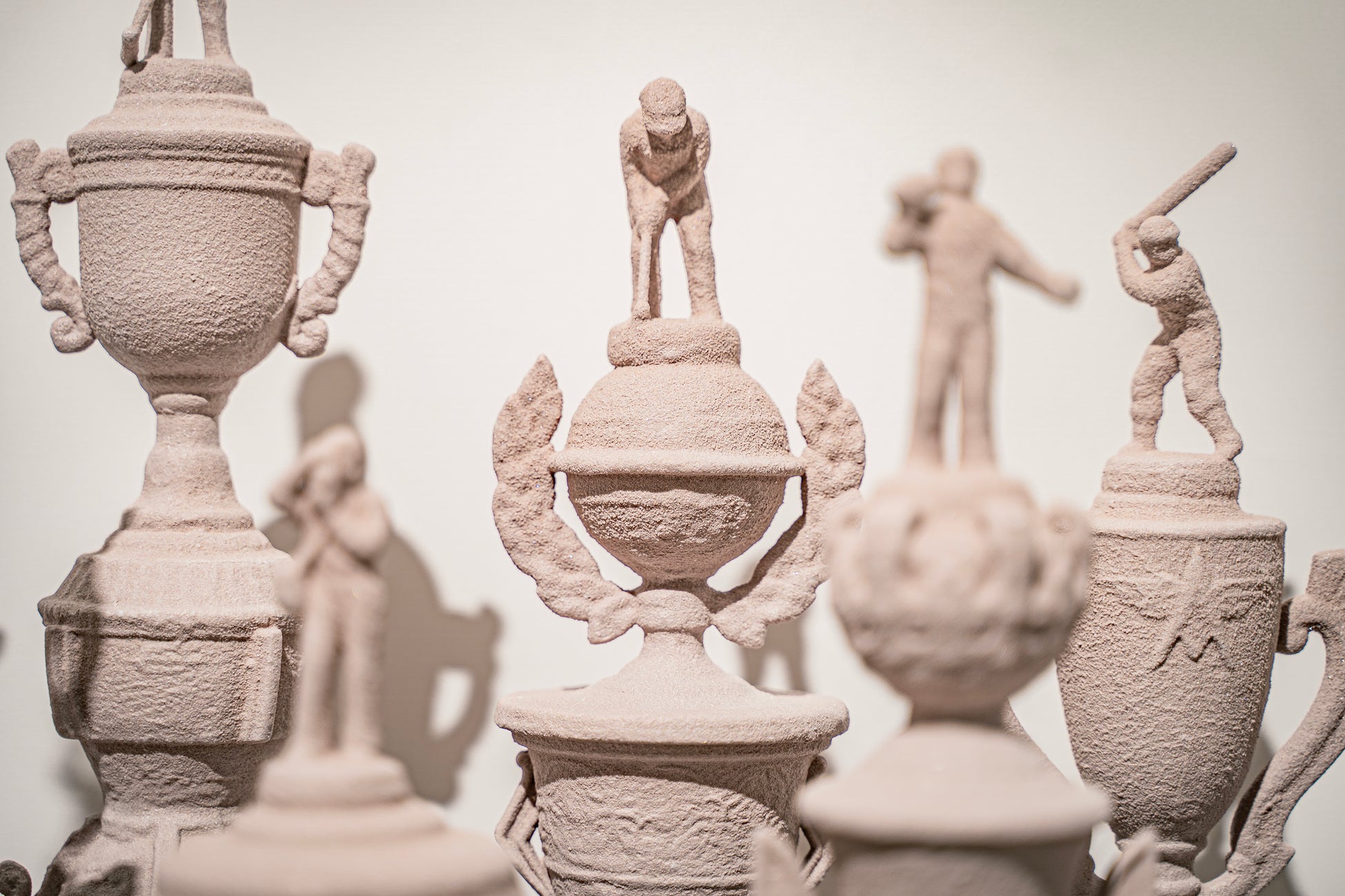 不要になった様々なトロフィーを特殊な砂でコーティングし、リデザイン