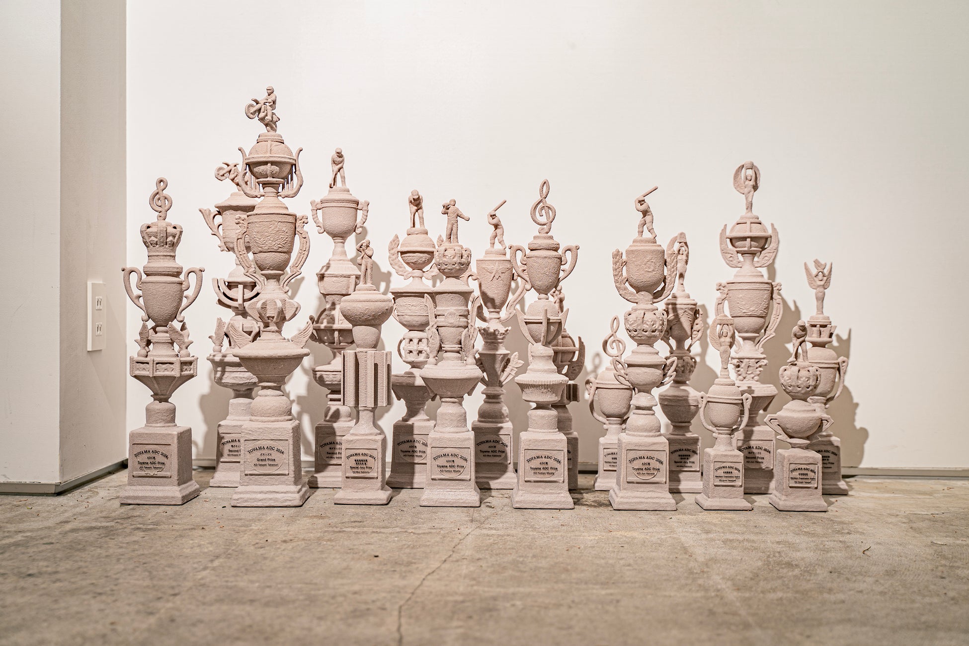 不要になった様々なトロフィーを砂でコーティングし、リデザイン について
