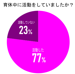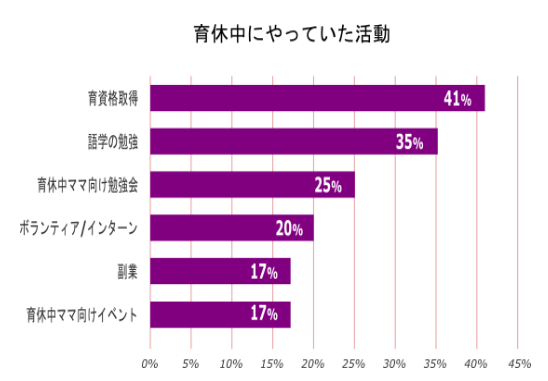 mogが実施したワーママ100人アンケートでは、育休中に何らかの活動をしていたと回答した人は77%と8割に迫る結果となりました。活動でもっとも多かったのが資格取得で41%。続いて、語学の勉強が35%という結果になりました。ほかにもイベントや勉強会への参加、ボランティア/インターン、副業など、多岐に渡っていました。