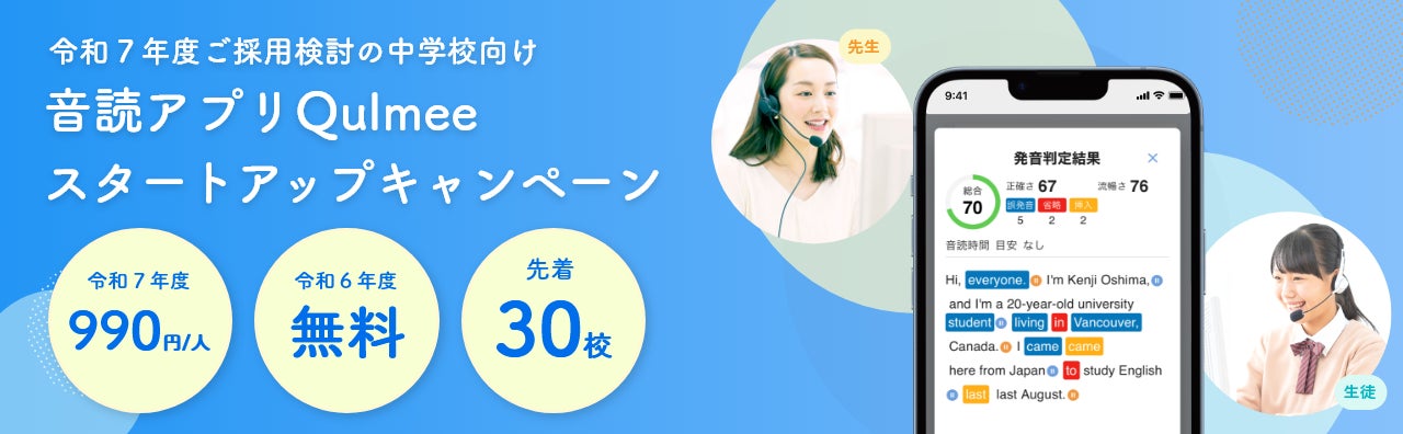 音読アプリQulmee、中学校向けにスタートアップキャンペーンを実施 ~1人あたり年990円で利用可能 先着30校限定~