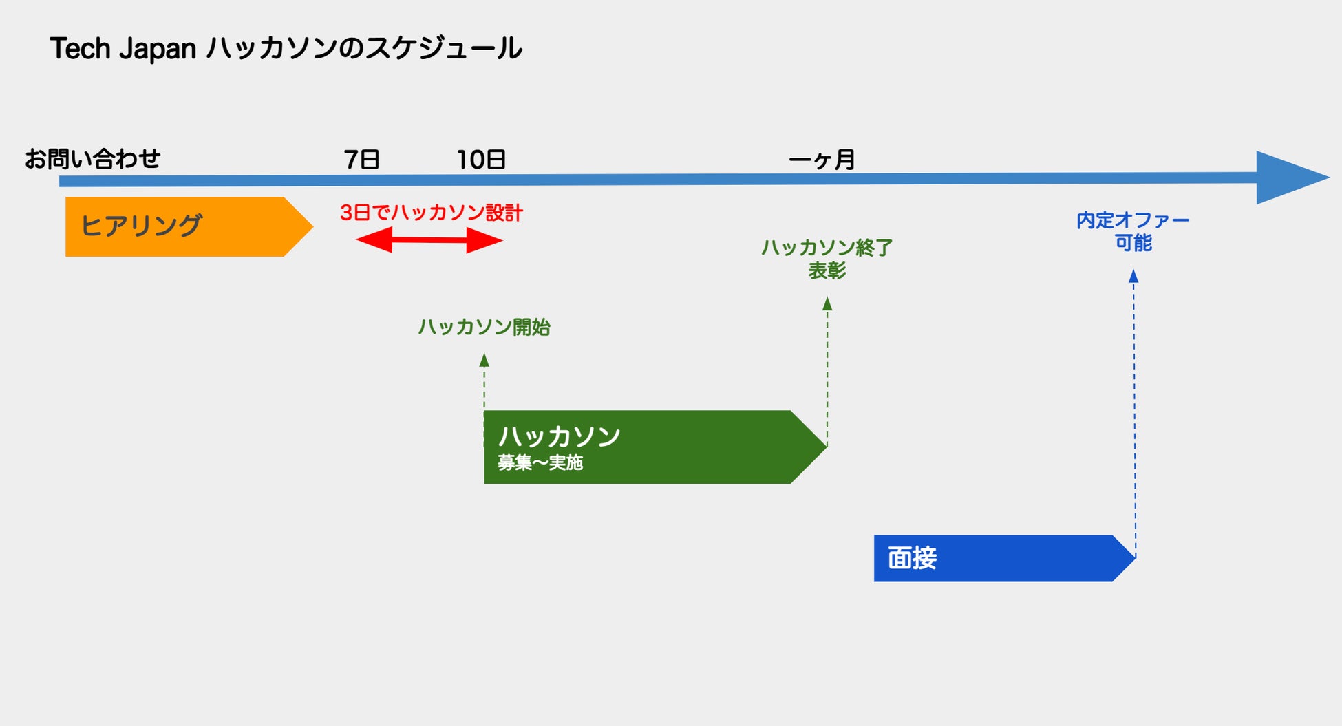一方、特に急成長が求められるベンチャー企業においては、しばしばスピード感を持って人材獲得を行う必要性も存在します。そのような要望に応えるため、今回Tech Japanは、相互理解の機会を維持しつつも、より短期間でスキル把握が可能なハッカソンの設計・実施サービスを新たに提供開始することといたしました。