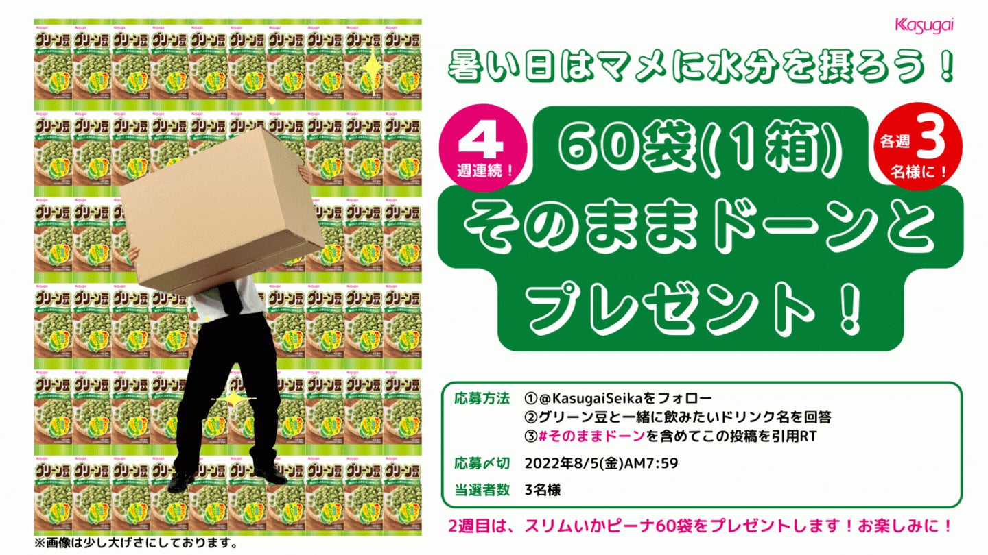 春日井製菓株式会社(本社:愛知県名古屋市、代表取締役社長:春日井大介)は、2022年8月1日(月)~8月29日(月)の期間、豆菓子60袋(1箱)が当たるプレゼントキャンペーンをTwitterにて4週連続で実施いたします。