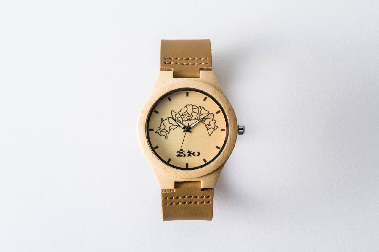 高知の地図をさりげなく入れていて、可愛くておしゃれかつ、ユーモアのある竹製腕時計。金属アレルギーの方にもおすすめです。
