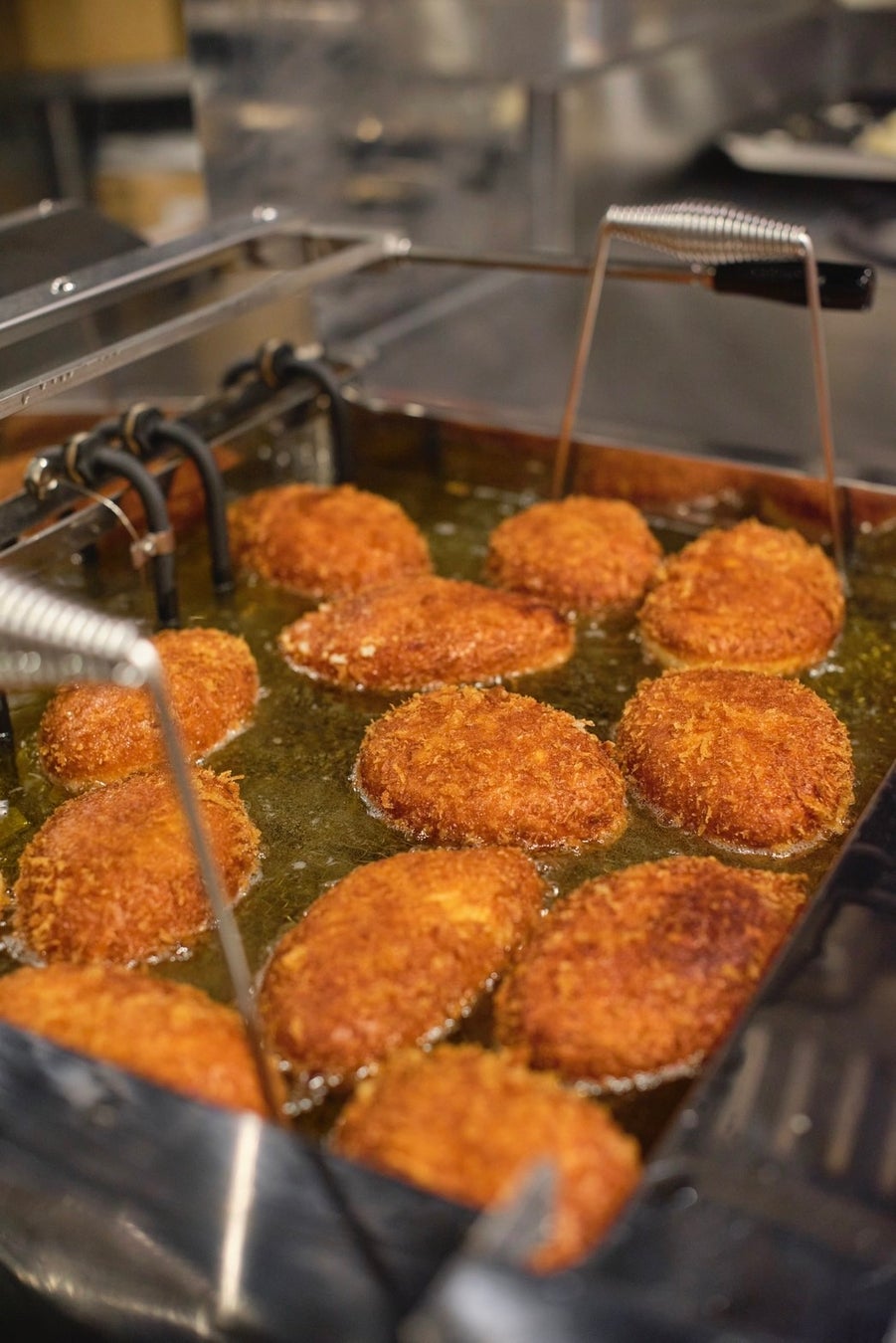 工場直送の生パン粉を使用しており、粗さなどはmm単位の調整をし、更には独自の粉をブレンドする事により、家に帰って食べてもサクサクした食感になるように仕上げております。
