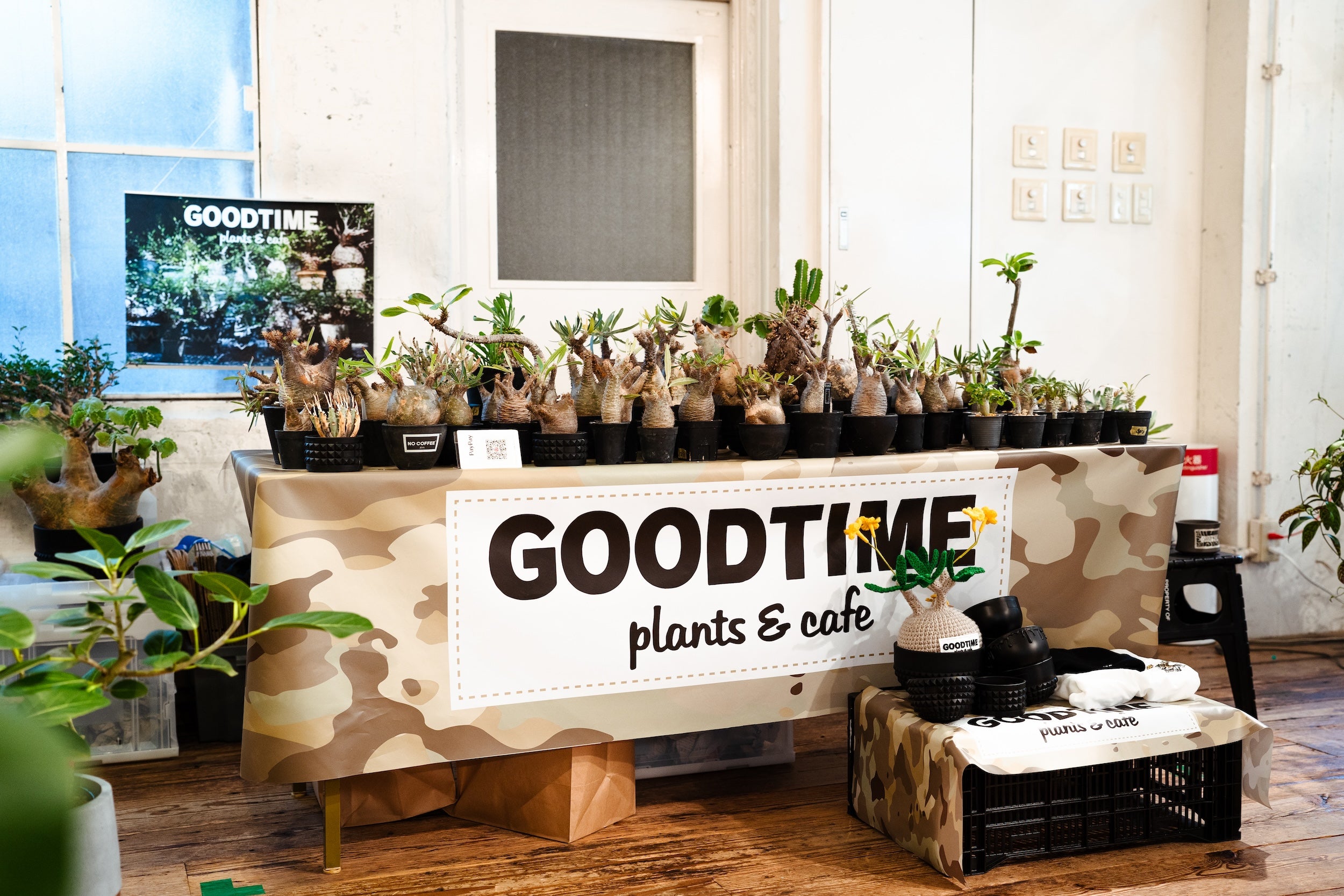 神奈川県横浜市で塊根喫茶(植物カフェ)を展開する「GOODTIME」。近年注目を集めている個性的な「塊根植物」がテーブルいっぱいにラインナップ。