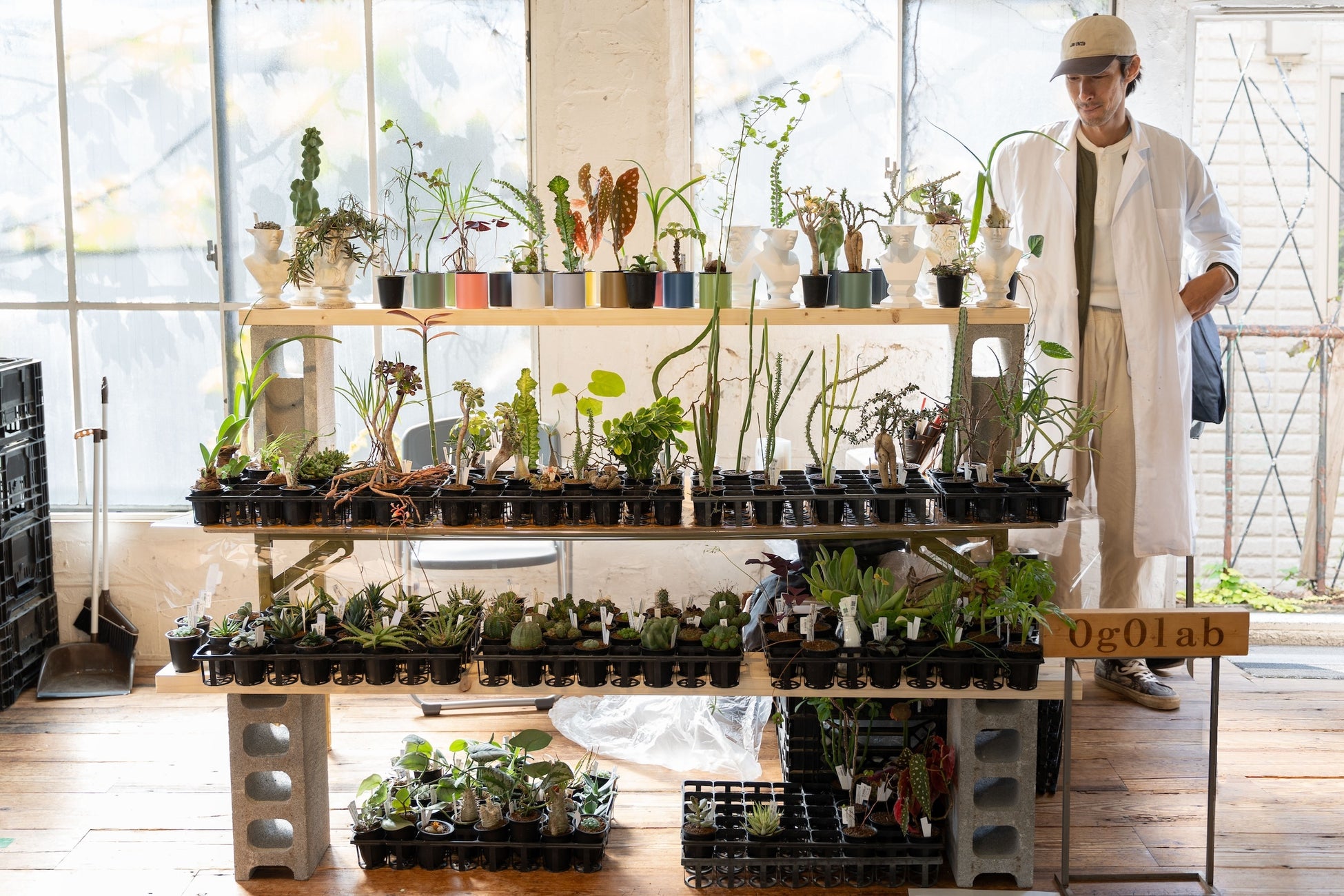 多肉植物・サボテンなどの生産をメインとし、群馬県の山麓にある温室で活動する「0g0lab(ゼログラムゼロラボ)」。バリエーション豊かな多肉植物のほか、アート作品のようなプランターも販売。