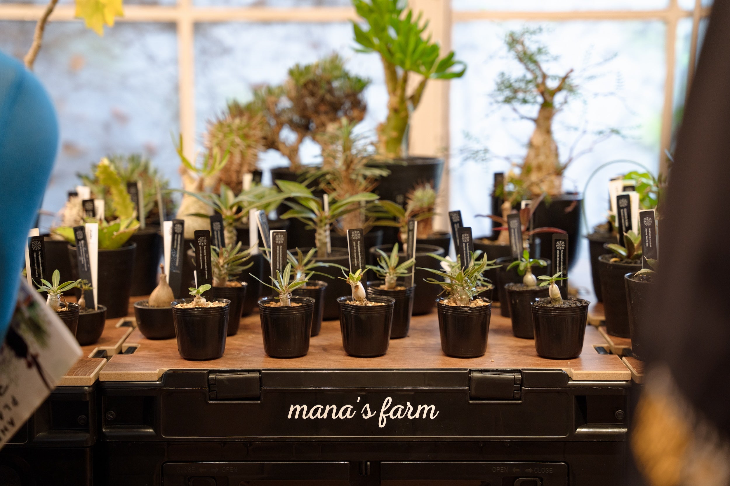 埼玉県所沢市でアガベや塊根植物、庭木を販売する「mana's farm」。塊根や多肉植物を中心に、幅広いバリエーションの植物が並びます。存在感のある店構えも印象的。