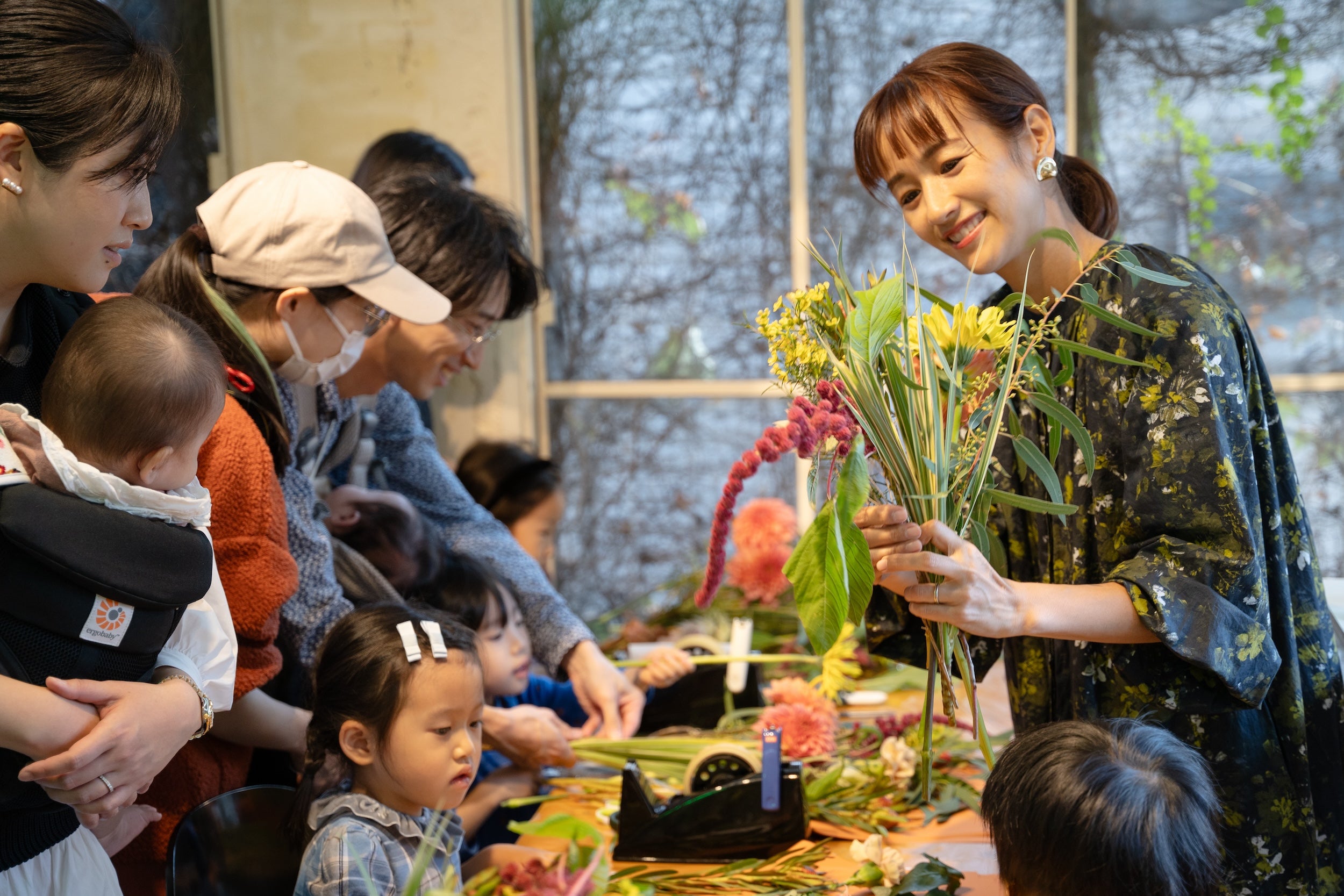 イベントが10月28日の開催だったことから、ハロウィンも意識しつつ、秋の草花や実物を使って、季節感いっぱいのブーケを作るワークショップを実施しました。前田有紀さんが講師となり、お子さまが自分で花束をくみ、お母さんへのメッセージカードを添えて完成!お母さん、お父さんに見守られながら、小さなお子さまも全員集中して上手に花束を作っていました。
