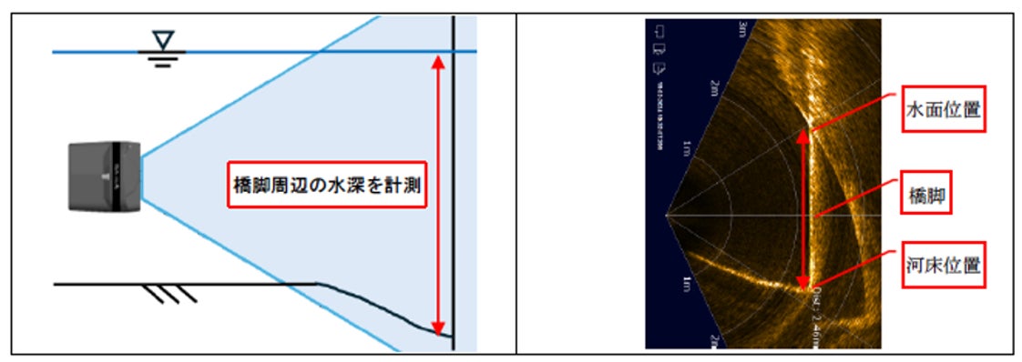 音響映像は、対象に対しほぼ直角にソナーを照射した際の映像であり、正面の橋脚や河床の形状を音響映像より読み取る。また、ソナーが空気に対して強い反応として現れるので、橋脚上に水面位置が強い反応として現れる。水面位置と河床の距離を計測することで、水深の計測が可能である。