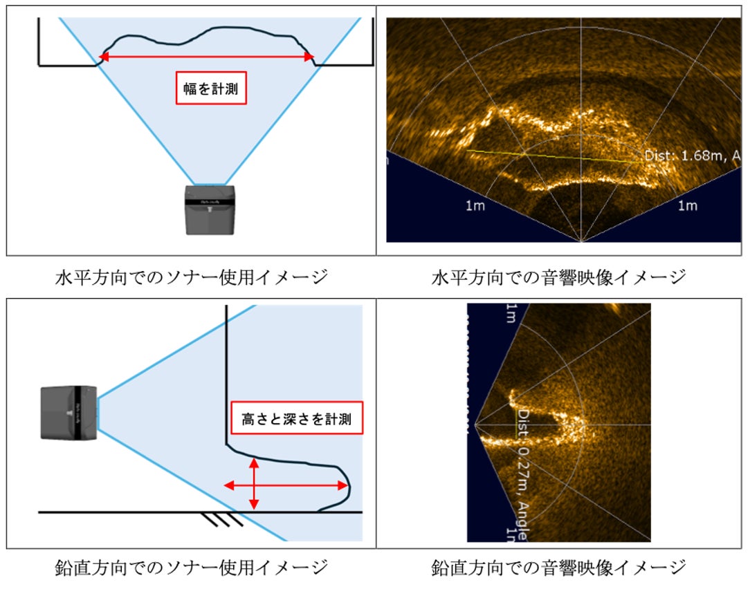 ソナーの信号は、水平方向に130°、垂直方向に20°の範囲に照射され、同範囲を音響映像として出力する。出力された音響映像から任意の区間の距離を計測する。計測は音速と反響時間の相関により計算する。水平方向に130°照射した場合、出力される音響映像は平面図のイメージとなり、断面欠損においては幅の計測が可能である。また、鉛直方向に130°照射した場合、音響映像は断面図のイメージとなり、断面欠損の高さ及び奥行きを計測可能である。