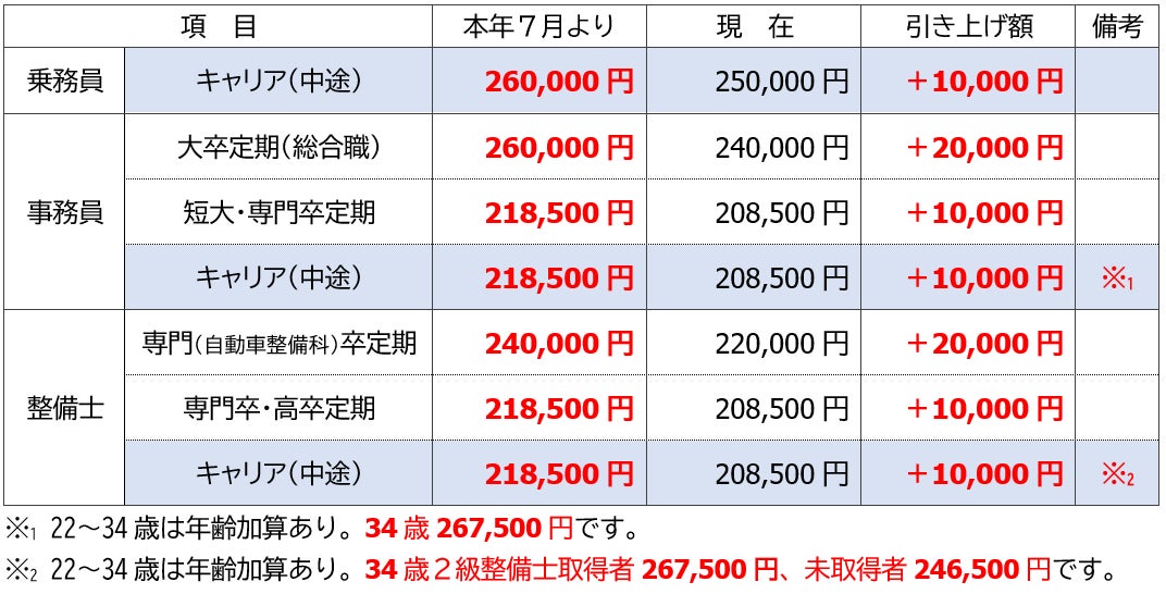 乗務員は今回の初任給改定で年収約20万円(昨年分を加えると約100万円)増額の見込みです。