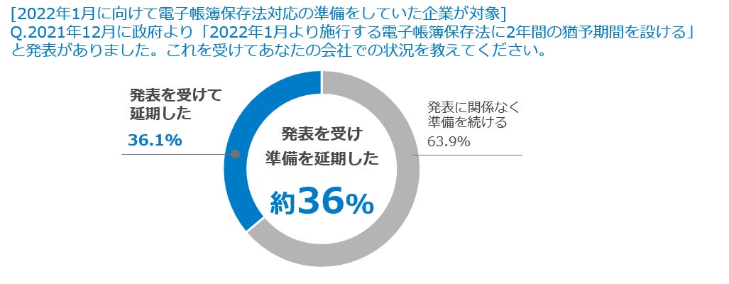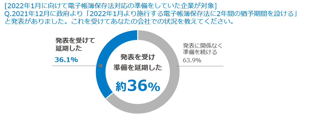 2022年1月に施行された電子帳簿保存法における「電子取引の電子保存義務化に2年宥恕」の発表を受け、2022年1月に向けて電子帳簿保存法対応の準備を進めていた企業の36.1%が「準備を延期した」ことがわかりました。