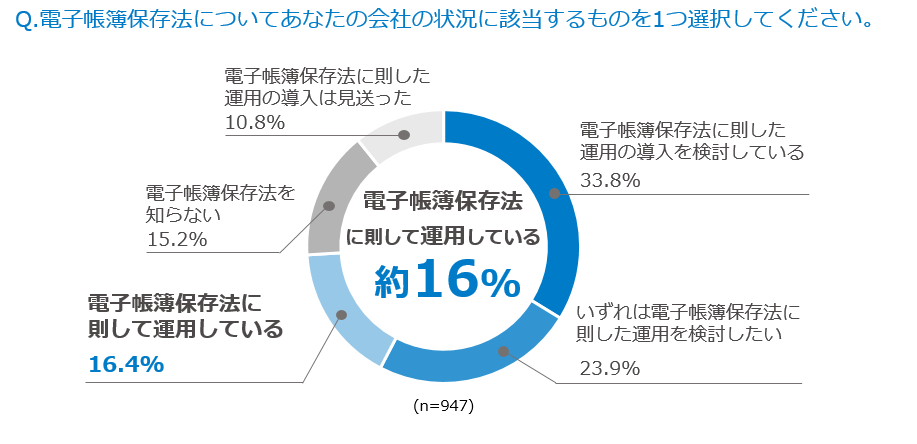 電子帳簿保存法への対応状況について、「電子帳簿保存法を知らない」と回答した割合は15.2%のみで全体の8割以上が認知しているにも関わらず、実際に対応できている企業は16.4%に留まる結果になりました。「電子帳簿保存法に則した運用の導入を検討している」33.8%、「いずれは電子帳簿保存法に則した運用を検討したい」23.9%と電子帳簿保存法に則した運用を検討している企業は一定数いるものの、実際に運用できている企業はごくわずかとなっています。