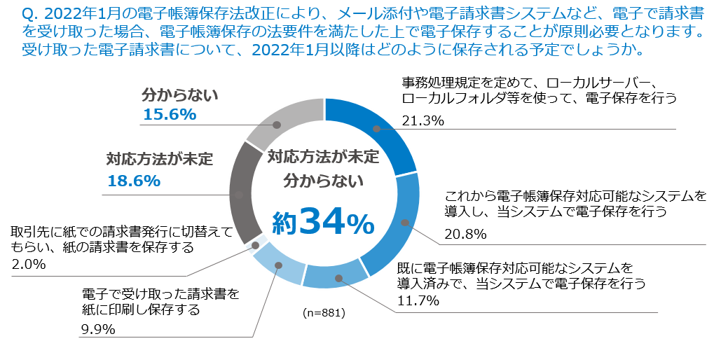 - 受け取った電子請求書への対応方法”未定”や”分からない”と回答した企業が3割を超え、混乱する状況が続く