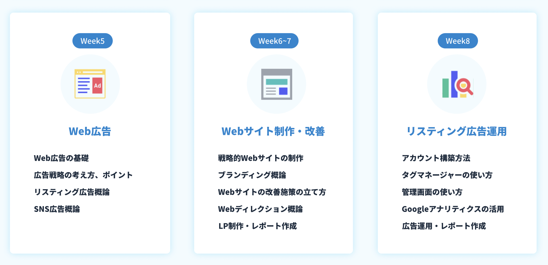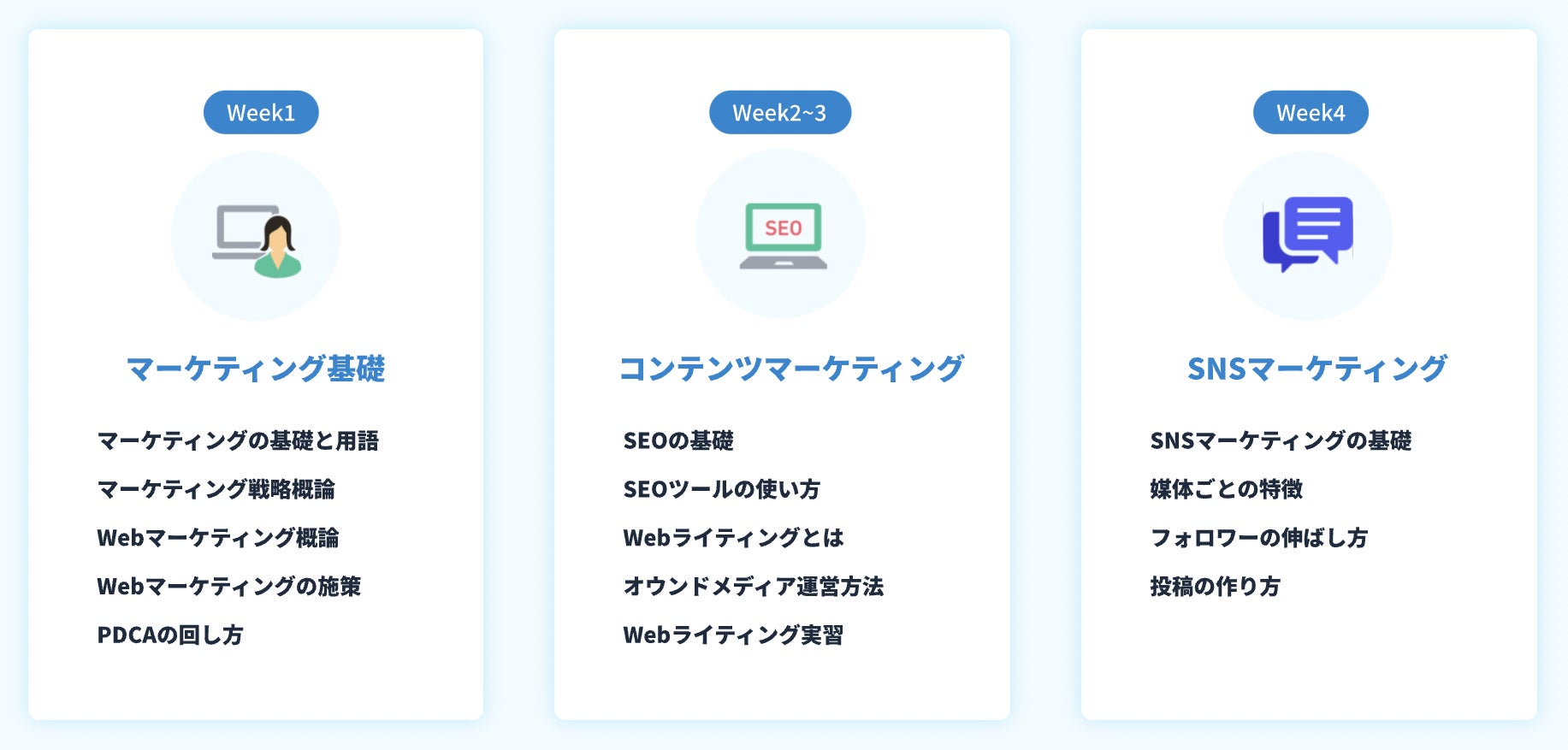 マーケティングの基礎から学び、戦略、コンテンツマーケティング、SEO、SNSマーケティング、Web広告、サイト改善と、マーケターに必要な全てを学ぶことができるカリキュラムになっています。