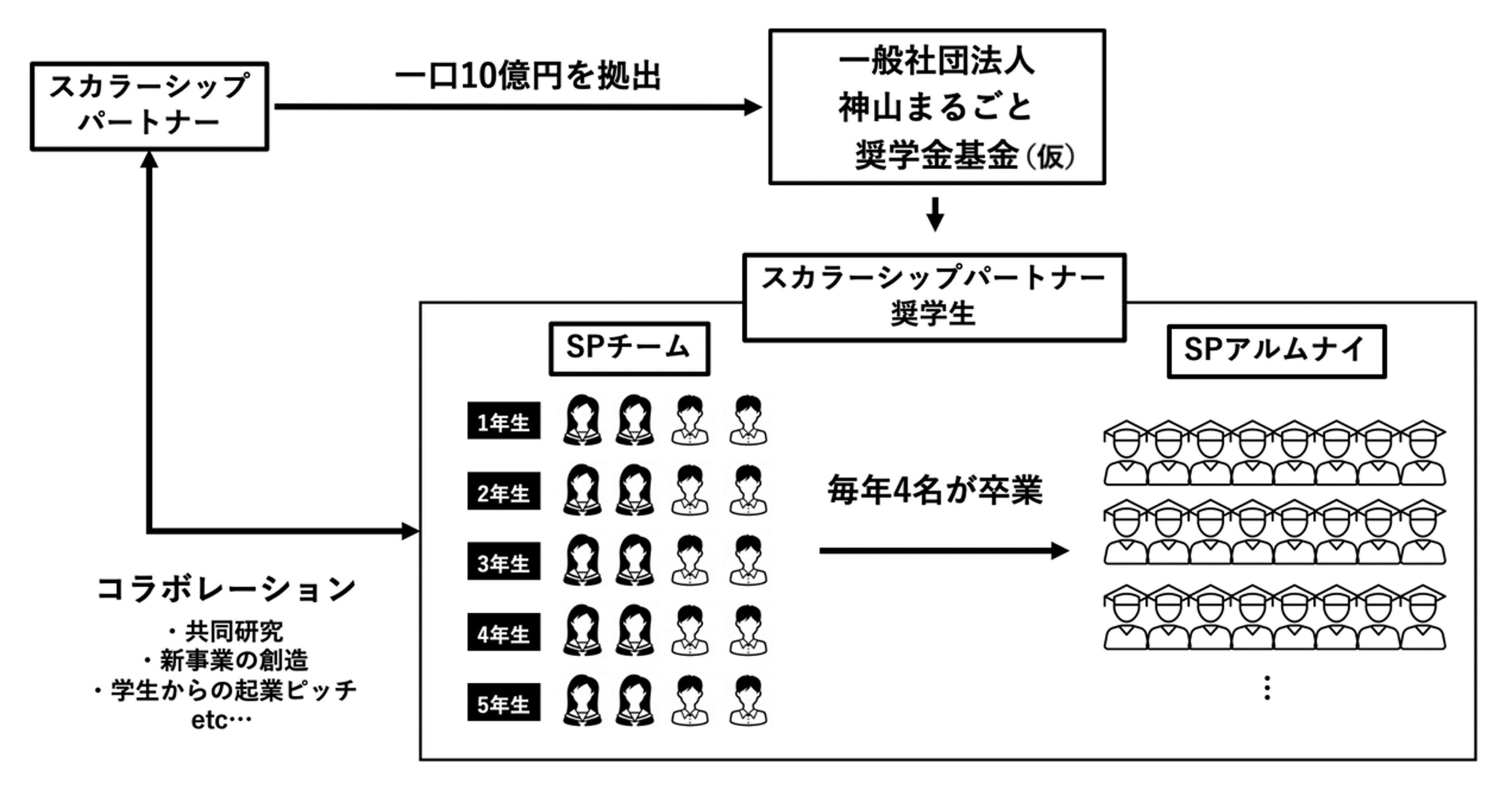 また、1企業につき各学年4名、同社の冠をつけた「〇〇企業 スカラーシップパートナーチーム」を組成します。在学中・卒業後において、拠出企業と、共同研究・新事業の創造・学生からの起業ピッチといった、連携活動を行うことを想定しています。