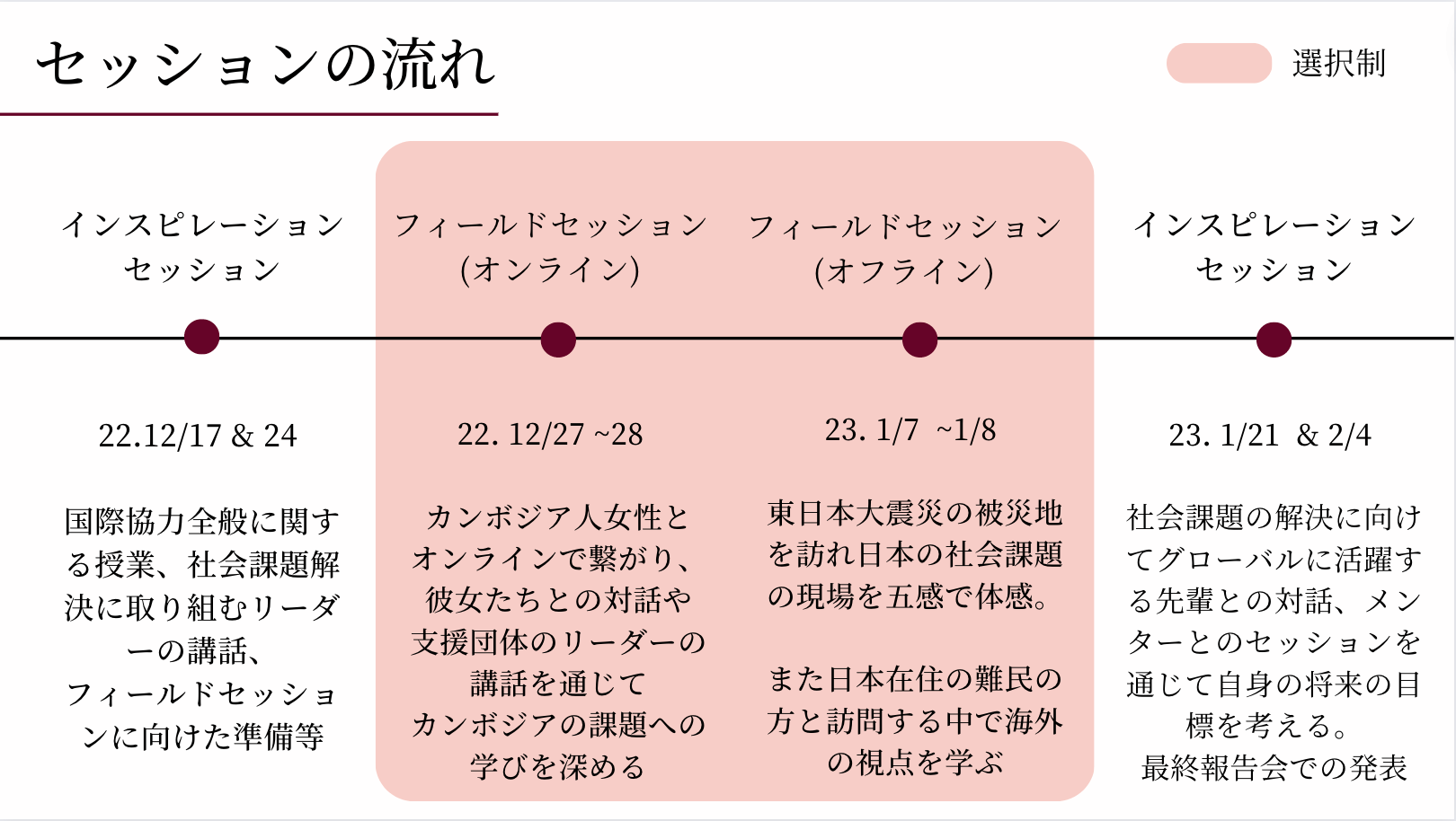 本プログラムは全国の高校生に対して国内外の社会課題に触れる機会を提供し、その解決を志すキャリアの選択肢を提示することを目的に実施しました。参加対象は全国各地の高校1年生から3年生で、今期は東北から沖縄まで20都道府県の公/私立高校から高校生27名が集いました。参加者はオンラインで国内外の社会課題と接点を持ち、その解決に取り組むNGOリーダーをはじめとするロールモデルとの出会いや、メンターによるコーチングを通じて、自身のキャリアの可能性を広げていきました。