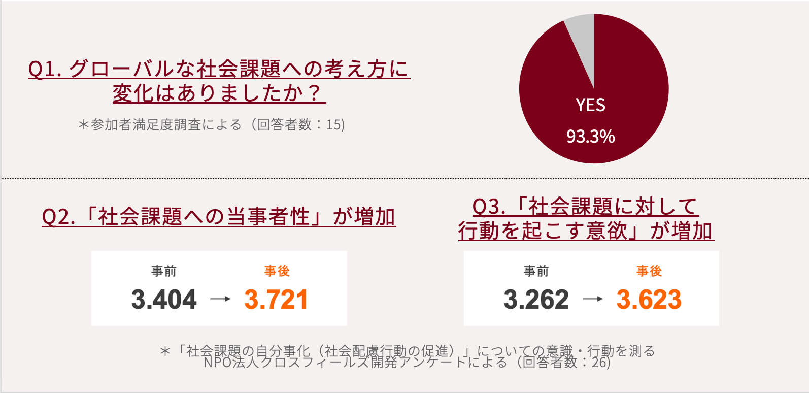 参加者アンケートでは90%がグローバルな社会課題に対する考え方が変わったと回答しました。またクロスフィールズが研究者とともに独自開発した「社会課題の自分事化(社会配慮行動の促進)」についての意識・行動の変化を測定する調査では、プログラムの参加前後で「社会課題への当事者性」や「社会課題に対して行動を起こす意欲」等、多くの項目でスコアが高くなることが分かりました。