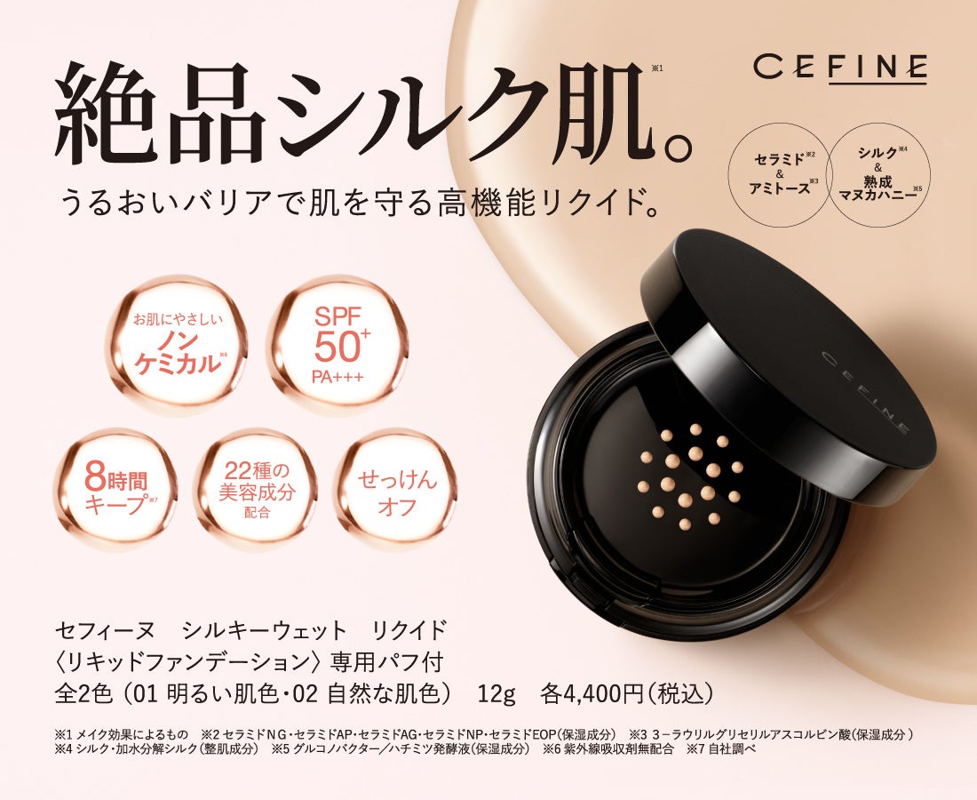 セフィーヌは1993年の創業以来、一貫して限りなく肌にやさしく、かつ限りなく効果が期待できる製品づくりを目指しています。今回、お肌へのやさしさとカバー力を兼ね備えた高機能リキッドファンデーション「シルキーウェットリクイド」を発表。