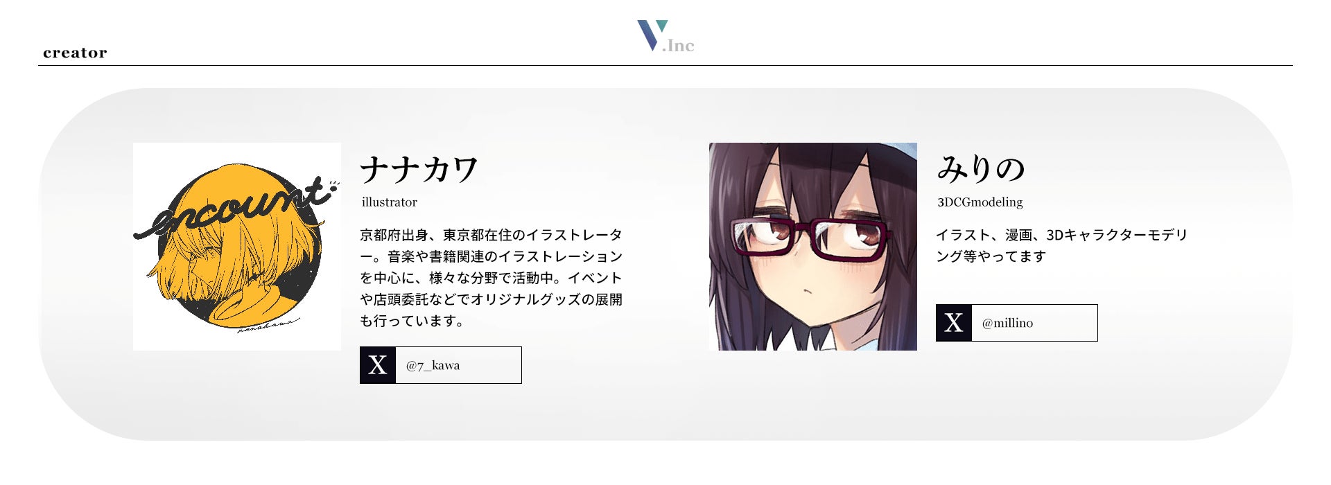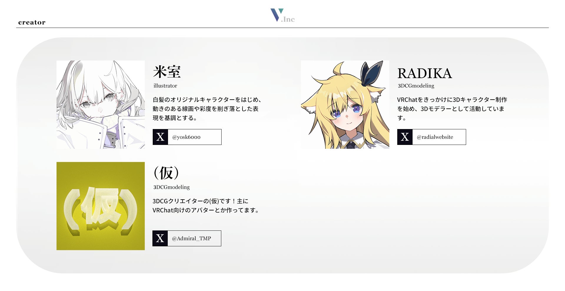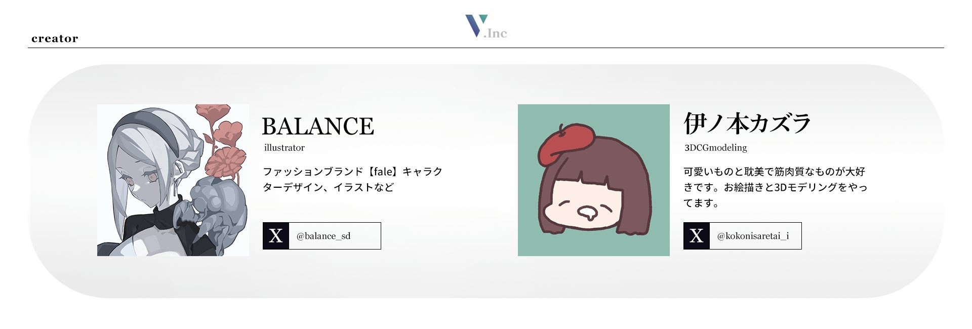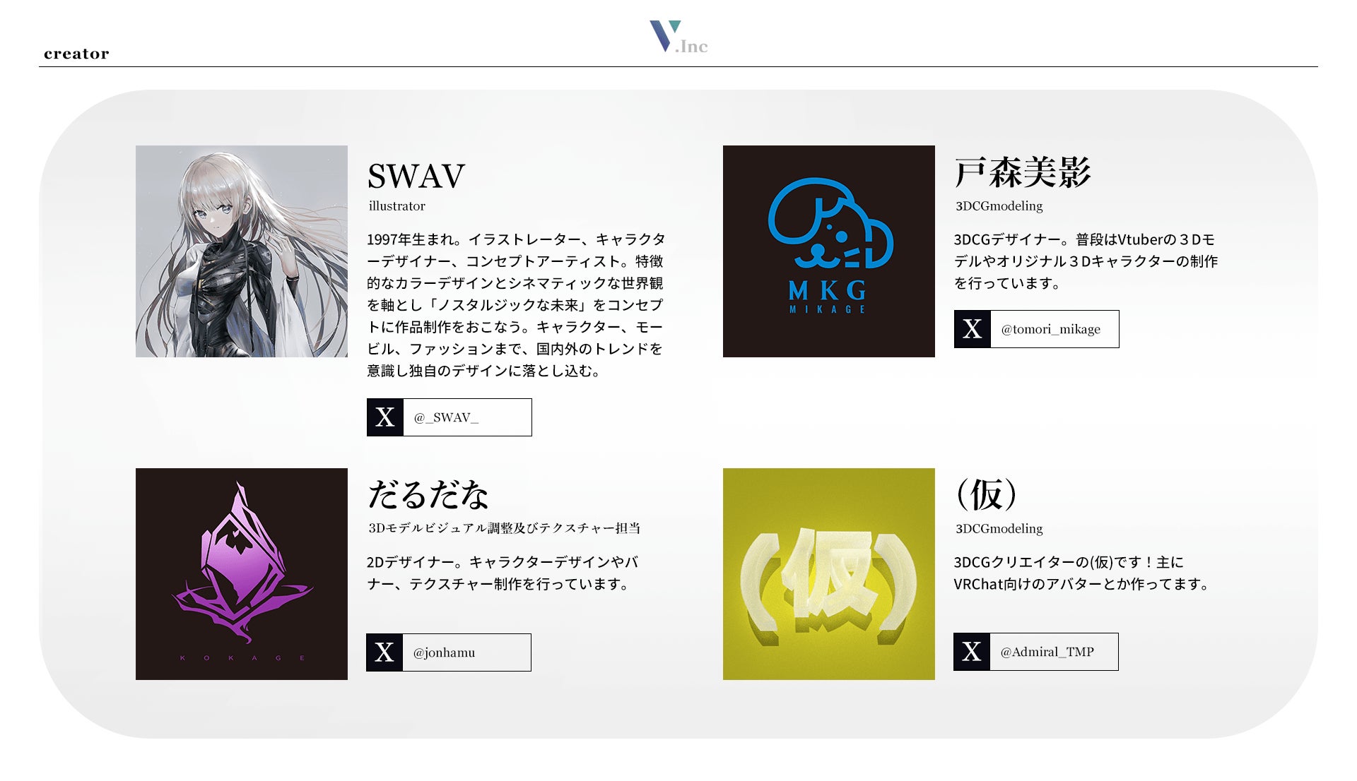Vは、国内でもまだ前例がほとんどない、複数販売アバターの同時制作進行/チーム体制での分業体制確立など、クリエイターのクリエイティビティを最大限発揮できるような仕組みづくりを進めております。