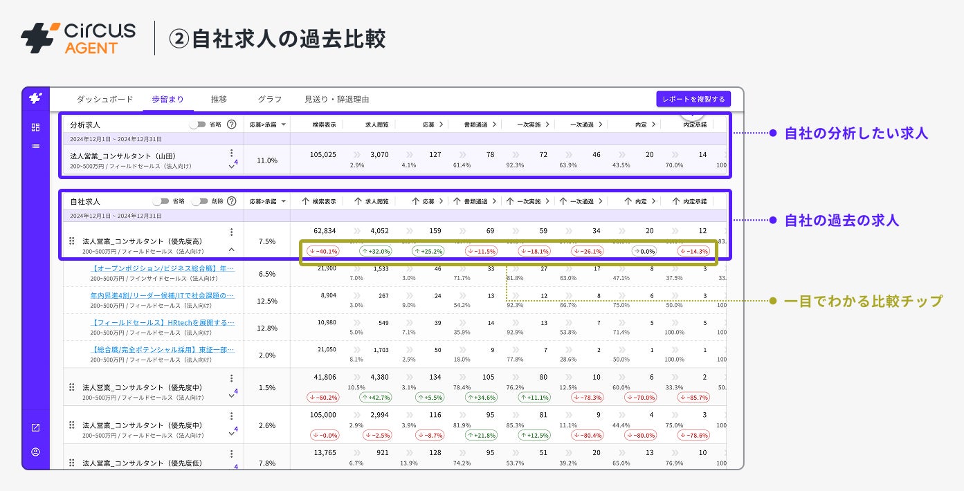 自社の過去の採用データと最新データを比較することで、施策の効果検証や改善サイクルの構築をサポートします。