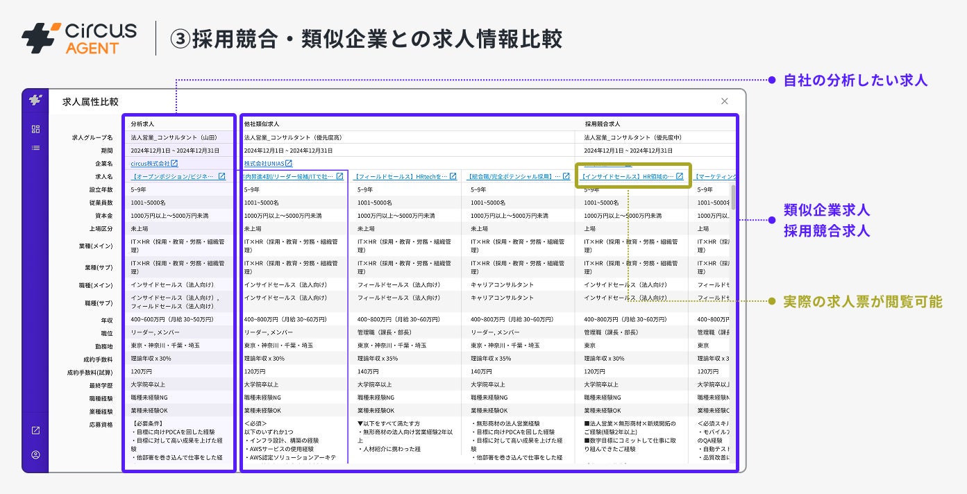 「他社採用データ閲覧機能」は、人材紹介プラットフォーム「circusAGENT」に搭載された新しい機能です。これまでは採用企業が閲覧することが難しかった「採用競合や類似企業の採用データ」を開示し、自社の採用データと比較・分析することが可能となり、より効果的な採用戦略の立案をサポートします。