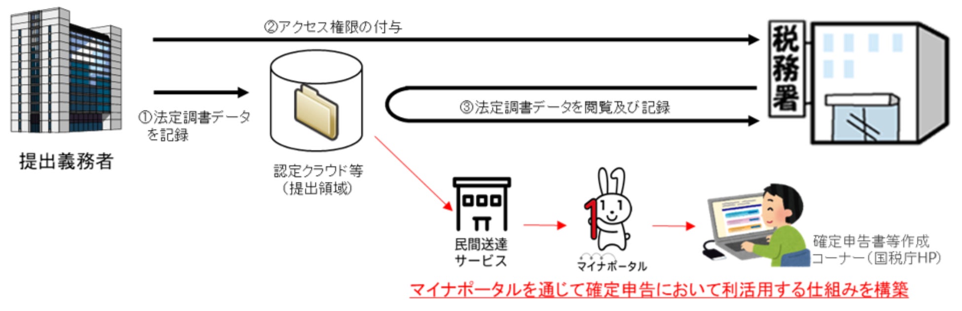 具体的には、法定調書の提出者が、①認定クラウドの提出領域に法定調書データを記録し、②税務署長に対して当該データを閲覧し及びe-Taxに記録する権限(以下「アクセス権」といいます。)を付与することにより、法定調書の提出を行うものです。