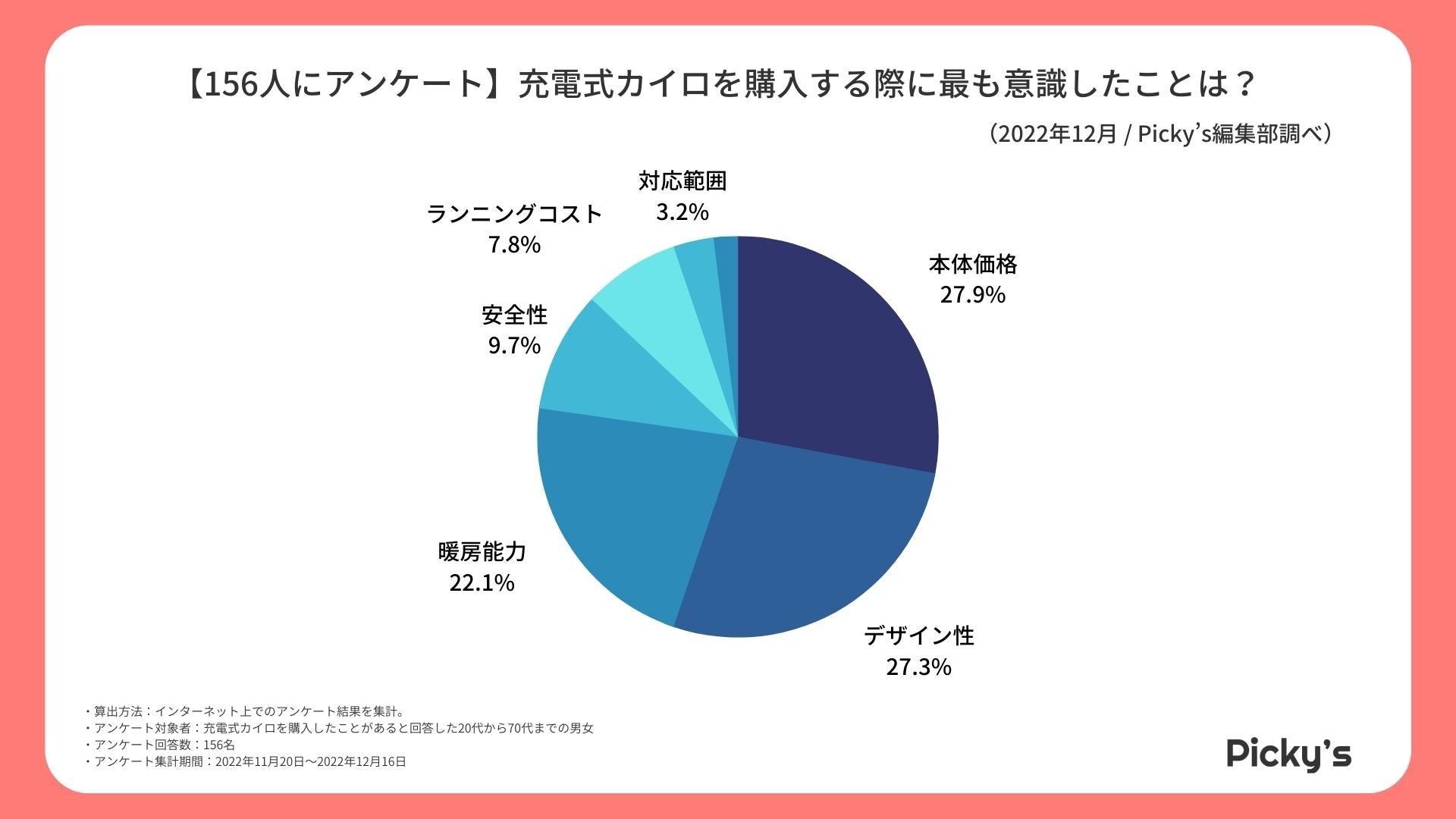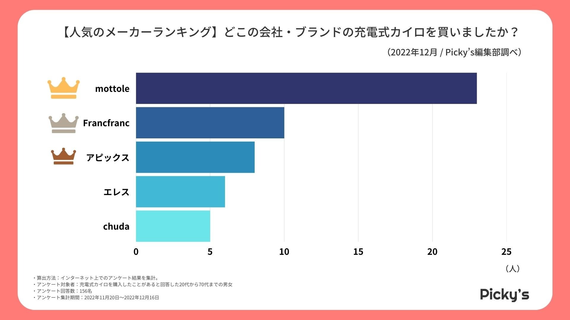 「Picky’s」は、インターネットショッピングにおいて、購入前に試せない・選ぶべきものがわからないという課題の解決を目標に、あらゆる商品のおすすめランキングや検証レビューを紹介するサイトです。このたびPicky’s(https://rentry.jp/note/)では、充電式カイロを買う際に意識していることや人気のメーカー・ブランドなどをインターネット上でアンケート調査を行い、ランキングを作成いたしましたので発表いたします。