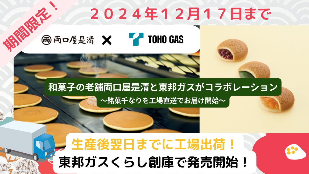 東海地方を中心としたお客さまのくらしを豊かにすることをミッションに掲げた東邦ガスと、同じく東海地方を拠点として全国で高い知名度を誇る両口屋是清さまがコラボレーションし、23年ぶりにリニューアルした両口屋是清の「千なり」を特別に工場直送でお届け!
