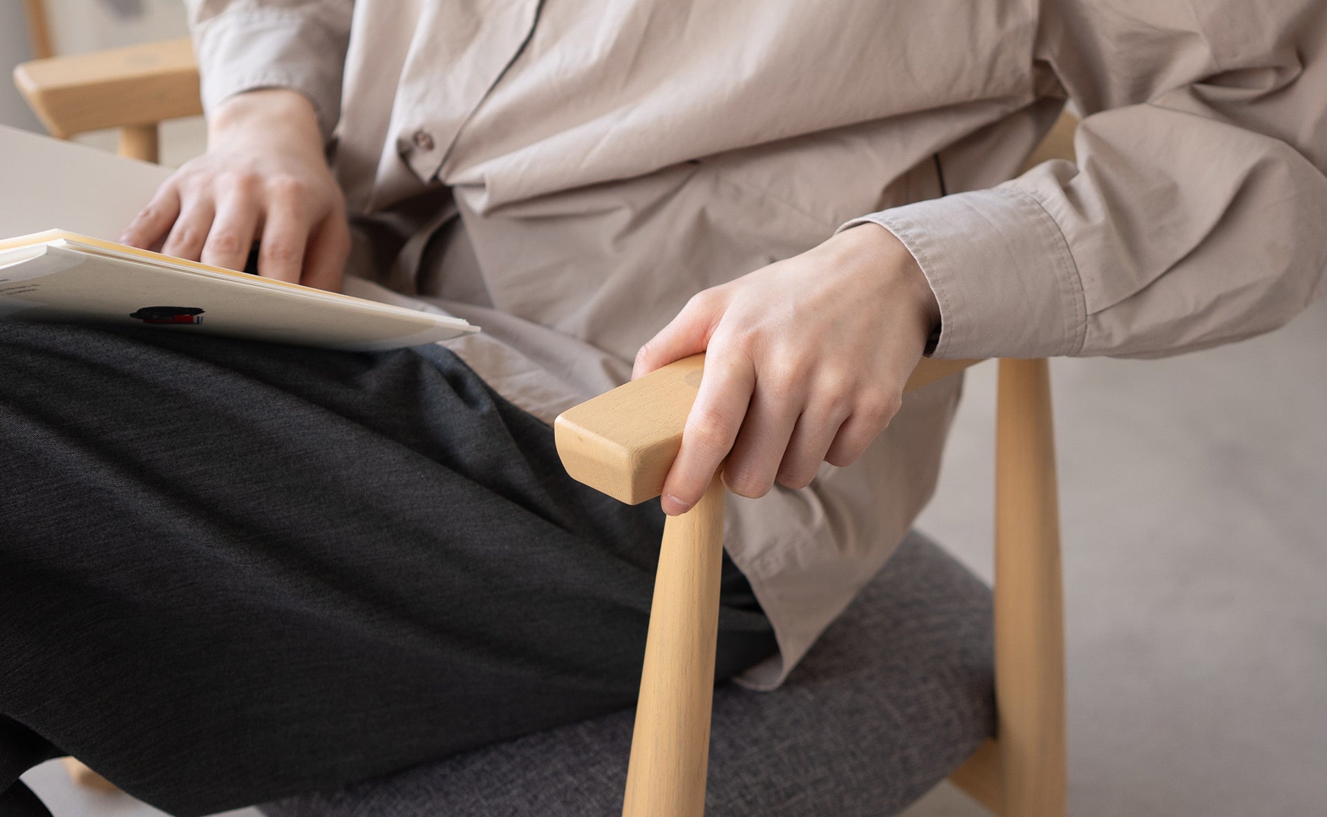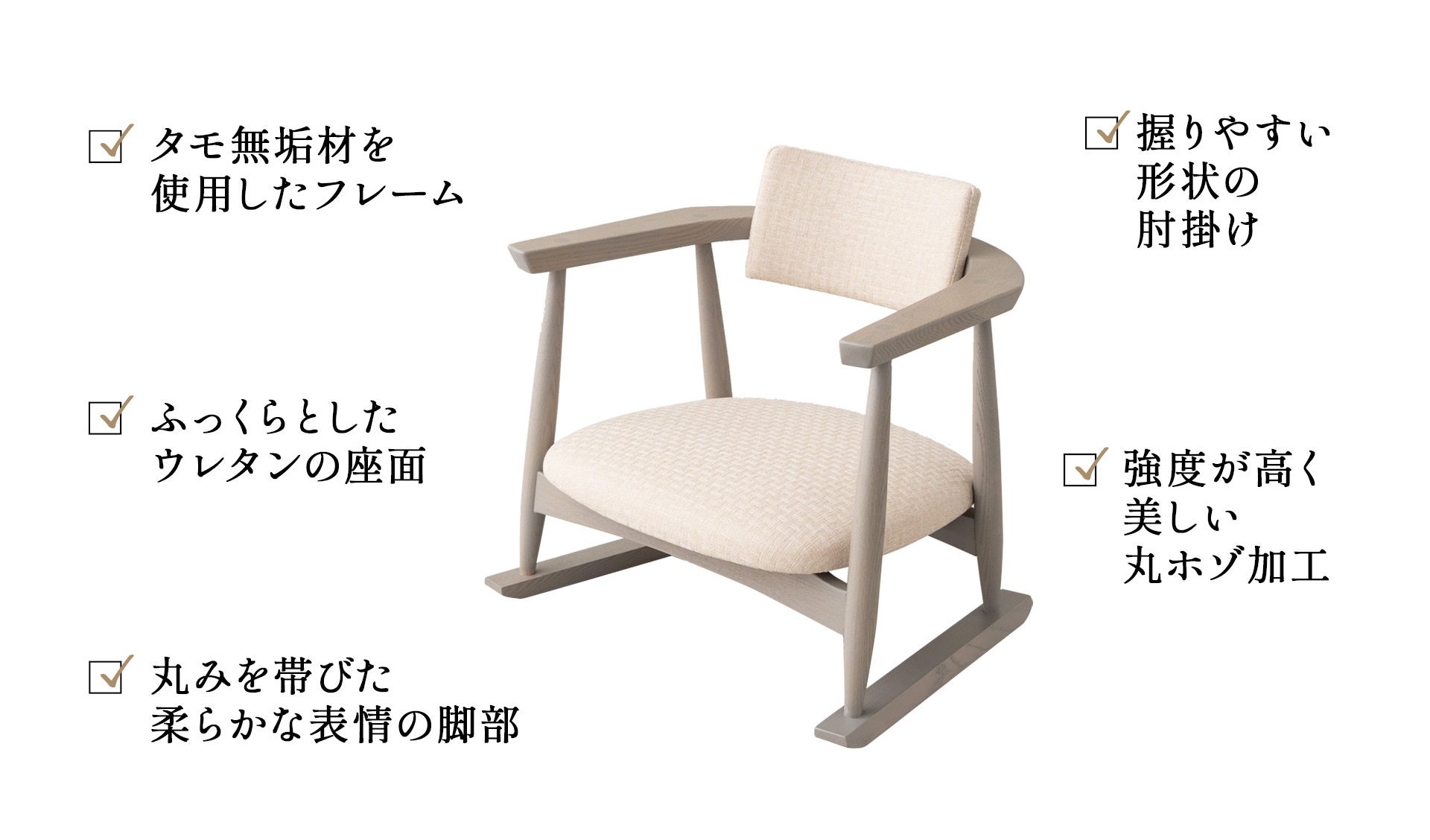 幅広の肘掛けは、掴みやすく、立ち上がる際に力を入れてもグラつかない安心設計。タモ材を使用しているので、肌触りが良いなめらかな仕上がりです。