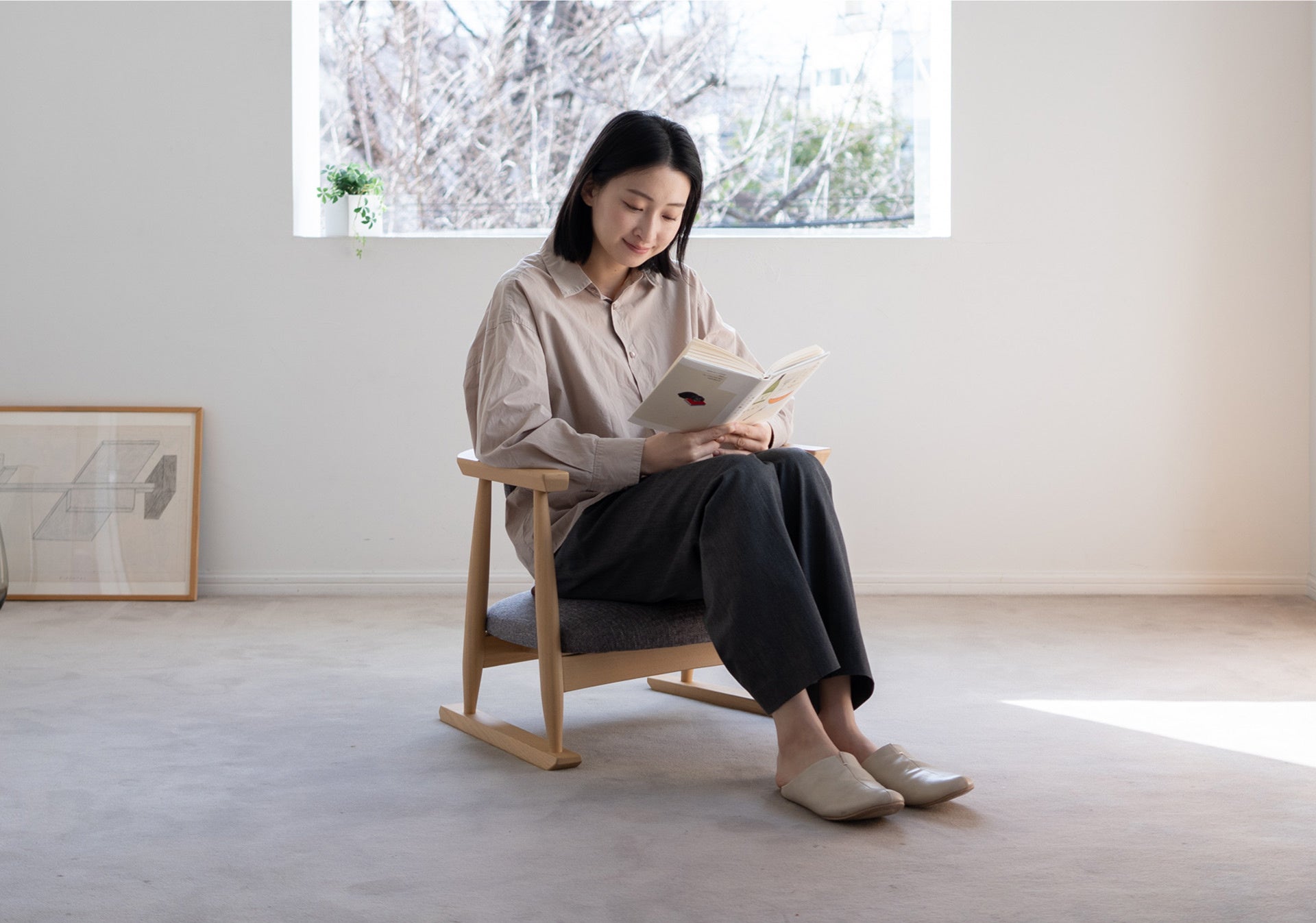 希少なタモ無垢材を使った低座椅子は、座り心地や立ち上がりのしやすさ、取り回しのしやすさのある機能的な低座椅子です。視覚的にも美しく、和室、洋室問わずインテリアに馴染むデザインの低座椅子です。