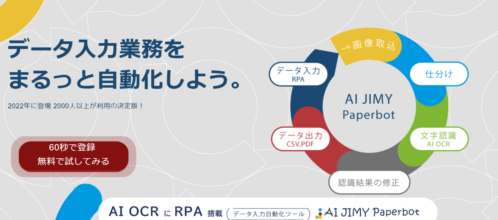 AI JIMY Paperbotは、AI CORとRPA機能を搭載し、紙資料やデジタルデータのシステムへの転記など、繰り返し発生するデータ入力業務を自動化するツールです。従来の手作業によるデータ入力にかかる時間とコストを削減し、業務の効率化を実現します。