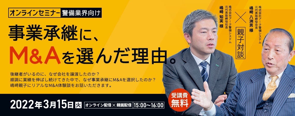 警備業界では、財政基盤の強化、人材確保や設備投資を目的としてM&Aを行うことが多い。特に人材の確保という観点からは、同業種のM&Aによって警備員をそのまま引き継げるのは大きな利点である。近年は、不動産業やイベント会社、介護福祉などの他業種と警備会社のM&Aも盛んに行われている。今回、警備会社を譲渡した嶋崎親子をお招きして、なぜ好業績の中、M&Aを決断したのか?本やインターネットでは聞けないリアルな体験談を語っていただきます。