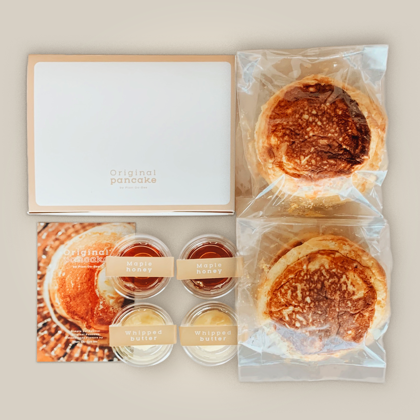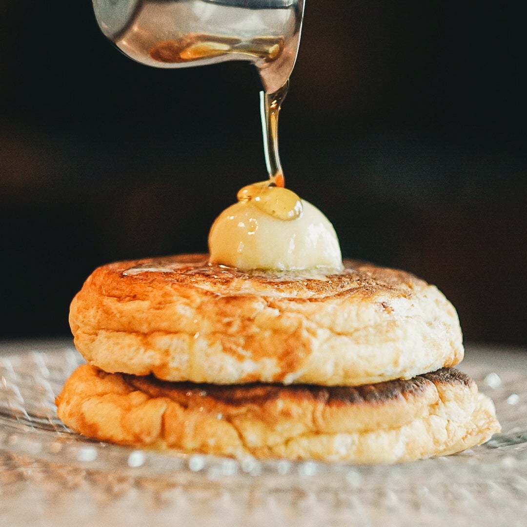 また、バスクチーズケーキだけでなく、同じくレストランで大人気のふわふわのパンケーキも、数量限定で毎日販売いたします。お店と同じようにお楽しみいただけるよう、1枚1枚丁寧に焼き上げたものを急速冷凍し、ホイップバターとメープルシロップもセットにご用意いたしました。