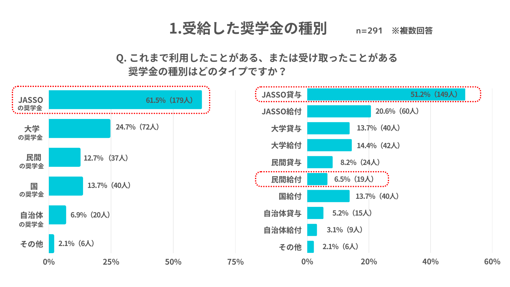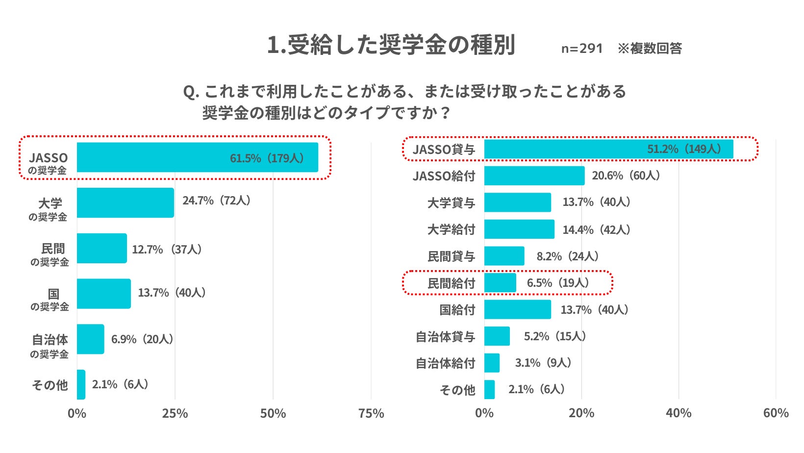1.【奨学金受給の現状】全体の約8割が貸与型を受給、給付型は3割。約6割が独立行政法人日本学生支援機構*(以下、JASSO)からの奨学金を受給し、民間の給付奨学金の受給者は1割未満。給付奨学金のさらなる普及、活用への可能性が期待される