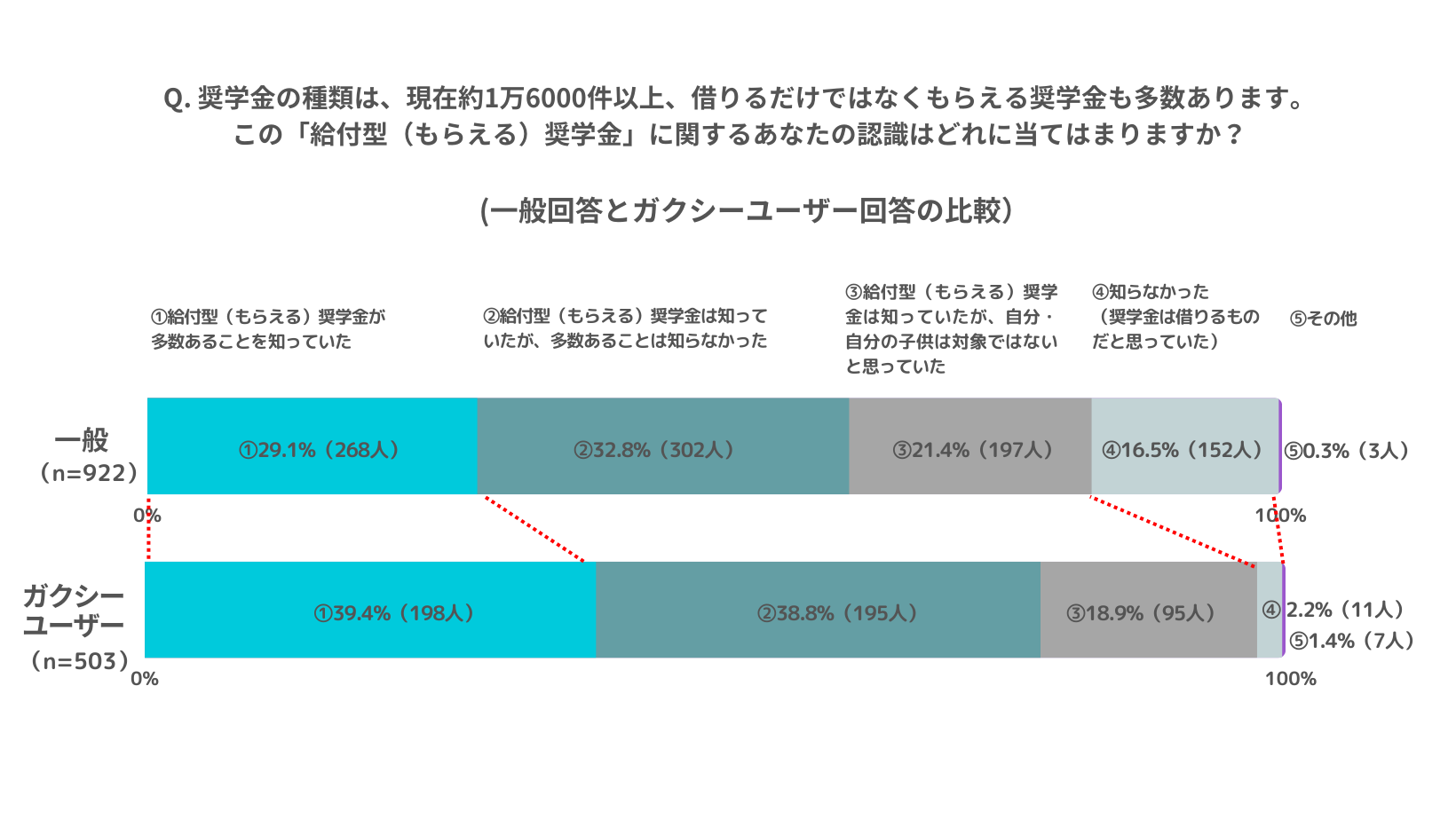今回の調査で、給付奨学金を受給した学生・保護者の中で「SNSや情報サイトなどインターネットからの情報」を活用したのは9.9%であったのに対し、ガクシーユーザーは37.8%でした。ガクシーユーザーにおける「民間奨学金運営団体からの給付奨学金」受給状況は29.6%と、一般の学生・保護者の6.5%に比べて約5倍高い結果となりました。また、給付奨学金に対する理解としては、ガクシーユーザーは一般の学生・保護者に比べて貸与奨学金の他に給付奨学金が多数あることを理解し、「奨学金は借りるものだと思っていた」という誤った認識を持つ層は、一般では16.5%に対しガクシーユーザーでは2.2%と少ない結果になりました。