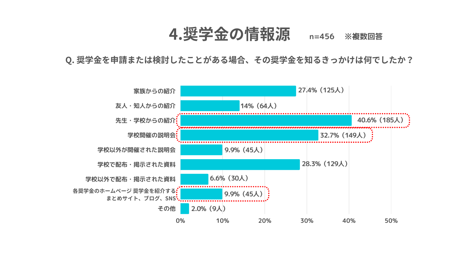 4.【奨学金の情報源】申請のきっかけ9割が「先生・学校からの紹介」などアナログな情報源から。インターネットによる情報源は約1割。奨学金情報のデジタル化の遅れも影響している可能性も示唆された