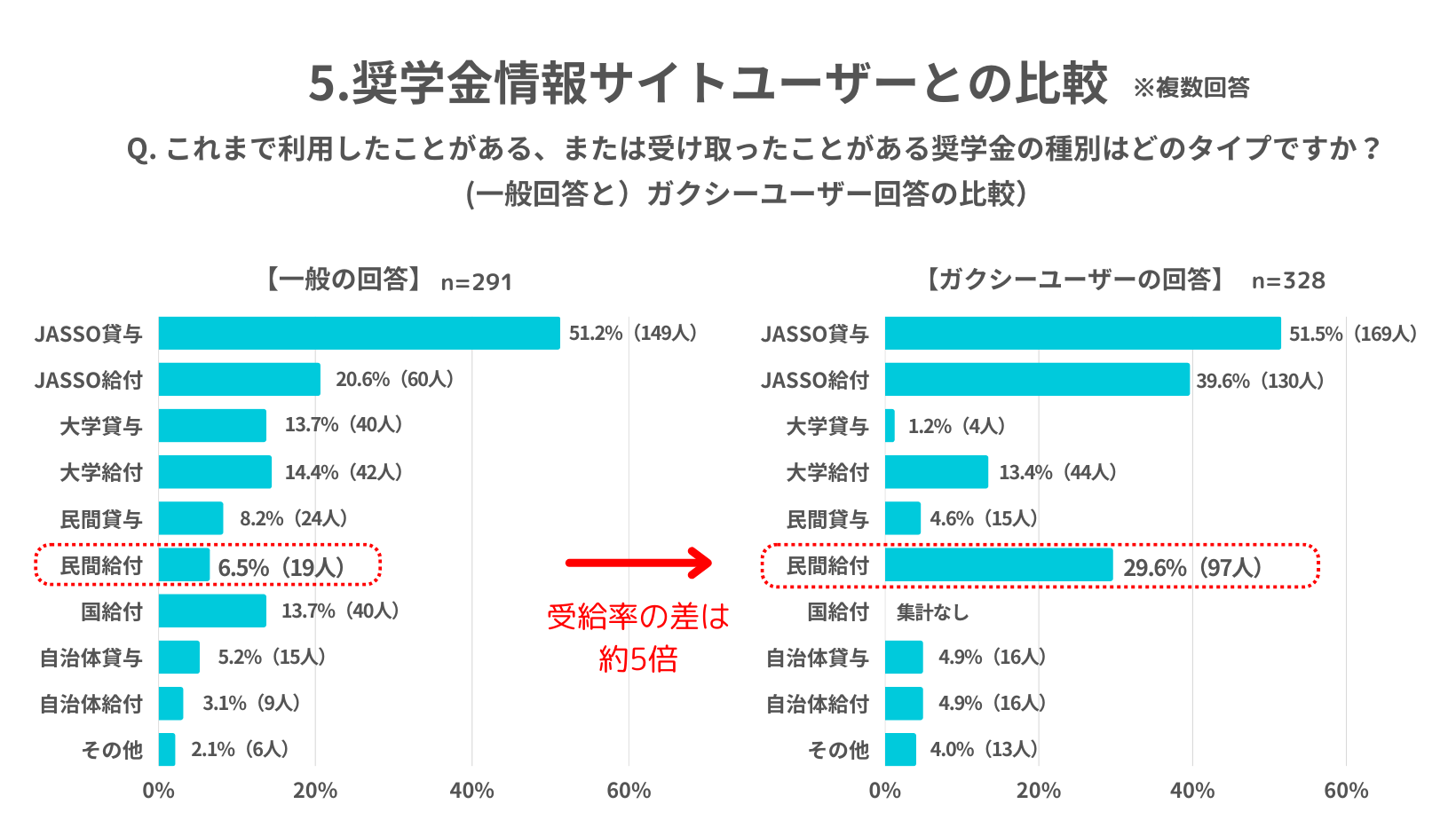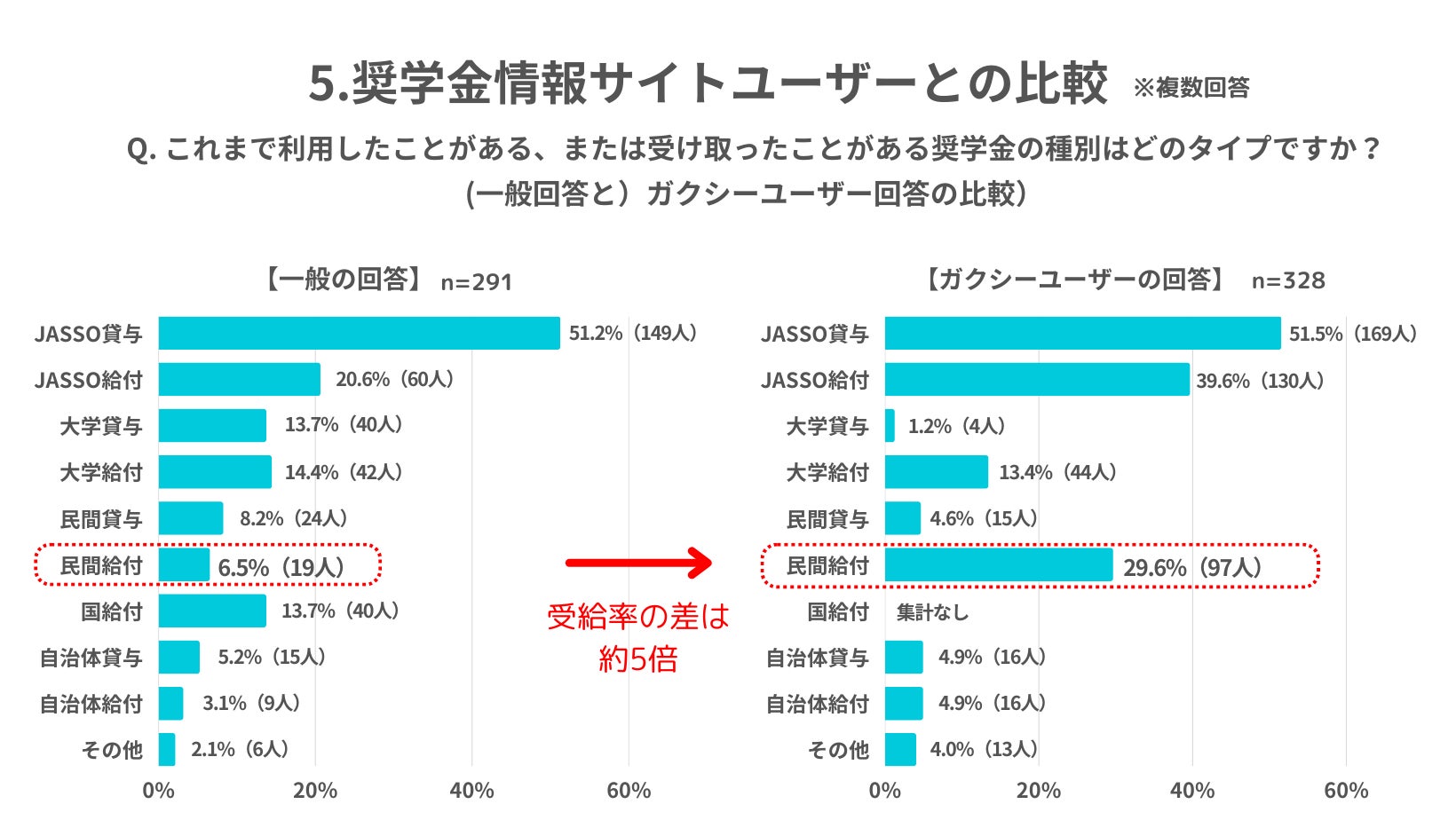 5.【ガクシーユーザーとの比較】一般の学生・保護者とガクシーユーザーを比較したところ、「民間奨学金運営団体からの給付奨学金」の受給率は、ガクシーユーザーが約5倍、一般よりも高い結果に。奨学金情報サイトの活用は、給付奨学金の獲得に役立ち、奨学金の正しい知識・理解にも有効であることが判明
